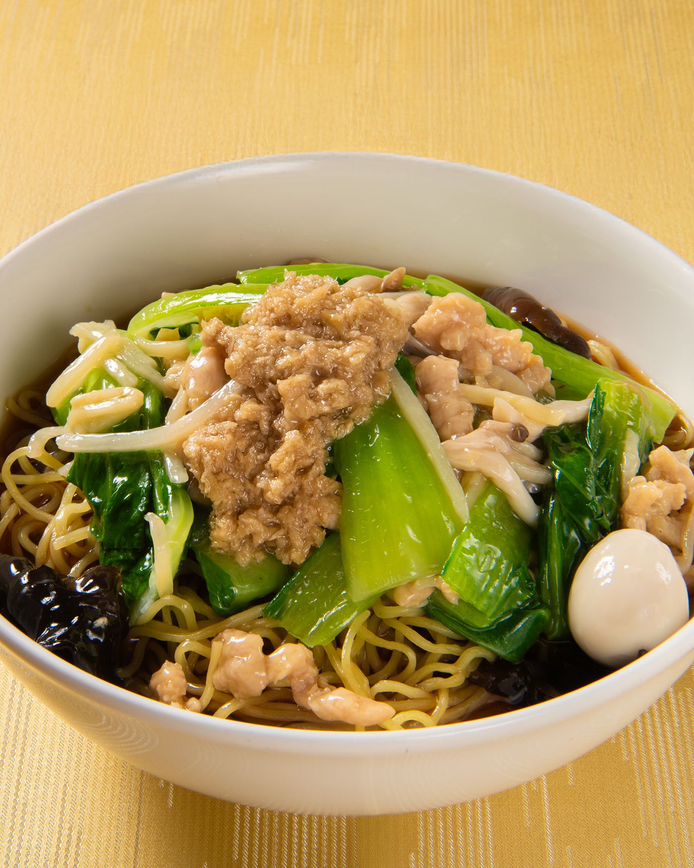 新潟グランドホテルの中国料理「慶楽」。その厨房から運ばれてきたのは、「豚肉とチンゲン菜のジンジャー餡湯麺」。穏やかな光をまとった一杯が、静かに目の前に据えられる。