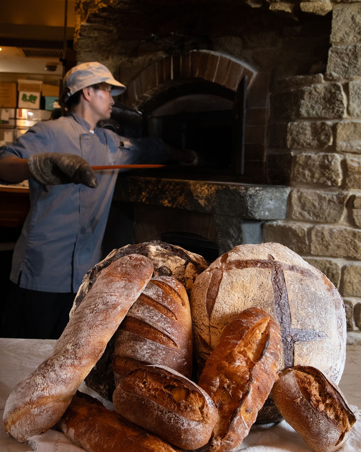 今回の撮影は、店の象徴でもある石窯を背景に据えた。手前には、焼き色の異なる数種のパンを積み上げる。重なり合うクラストの表情は、職人が積み重ねてきた時間の層そのもの。光を置く位置を数センチ単位で変えながら、焼き色の深さや粉の質感が最も素直に語りだす瞬間を狙った。