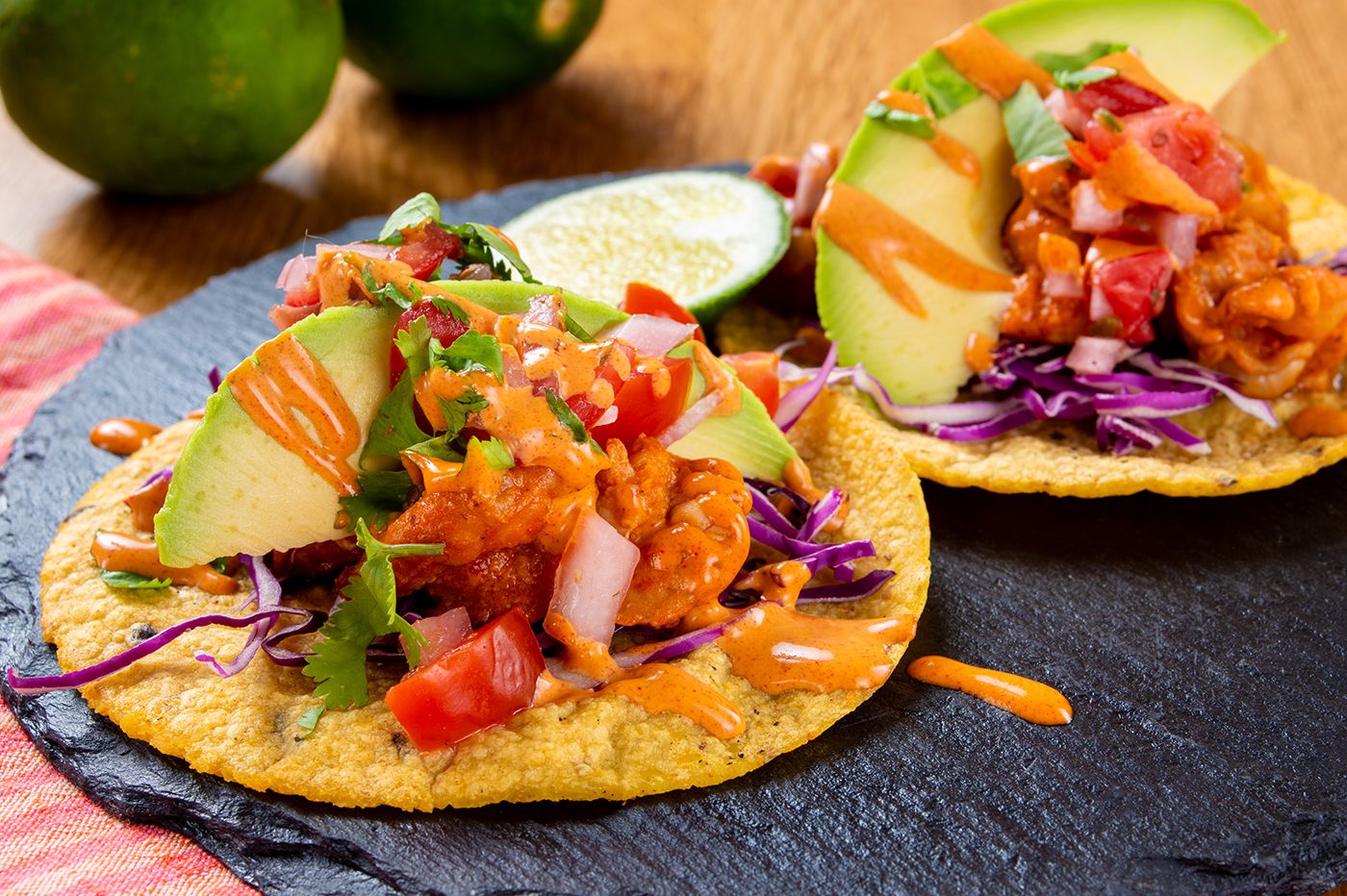 アボカドソースとニンニクでマリネされたエビは、しっとりとした艶をまとい、そばにいるだけで柔らかな気配を放つ。そこに紫キャベツがふわりと重なり、色の調和がゆるやかに広がっていく。さらにアボカドが加わると、タコス全体がひとつに包まれるような穏やかな景色が生まれた。