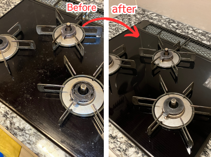 今回はコンロまわりを中心に、専用洗剤と丁寧な手作業でこびりついた油汚れを徹底洗浄!