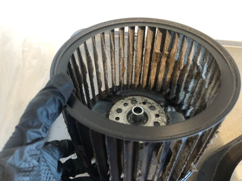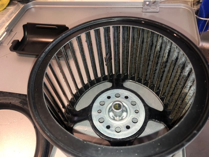 奥のファン(シロッコファン)やフード内のパーツには、知らず知らずのうちに油汚れやホコリがぎっしり。