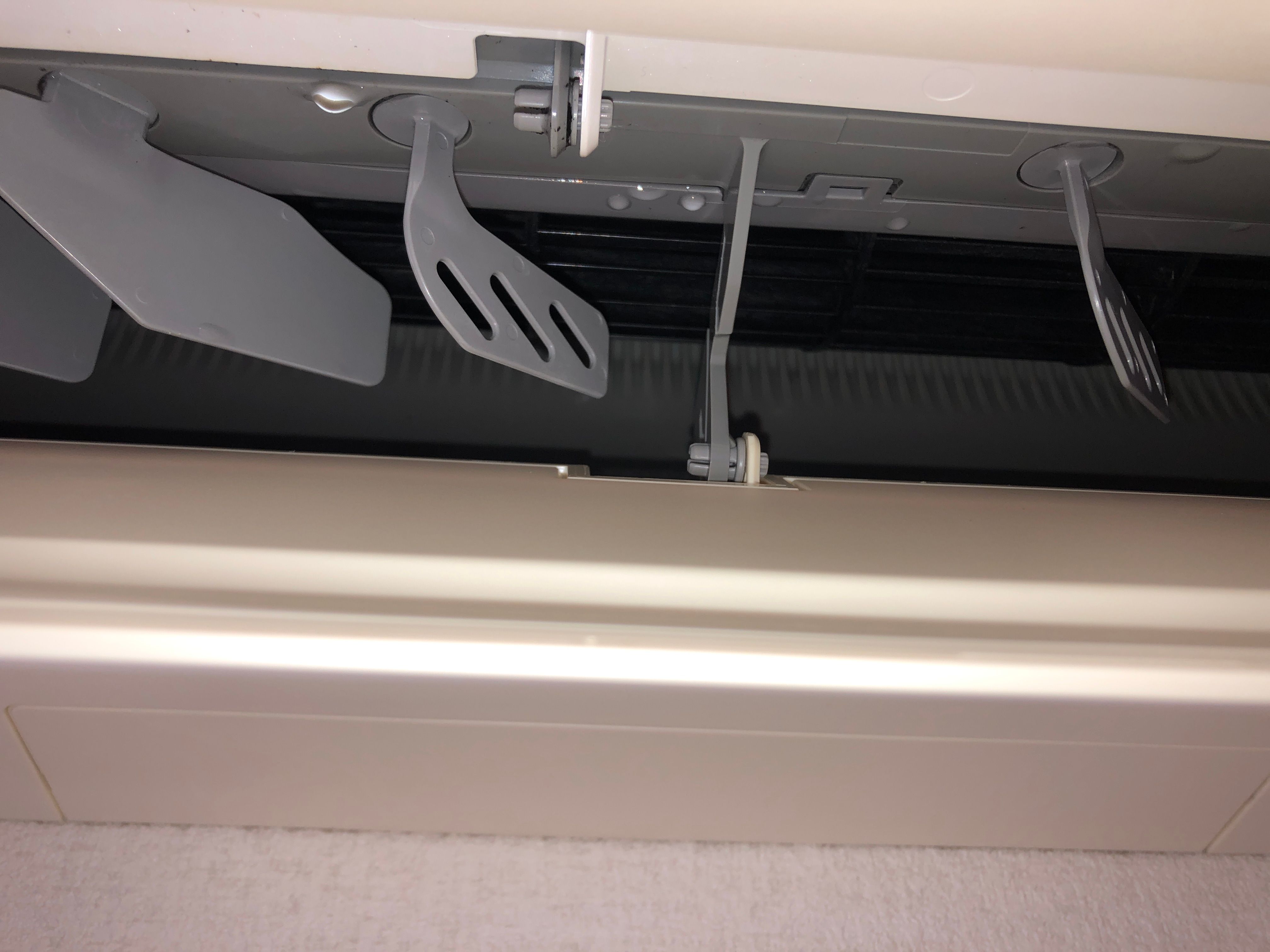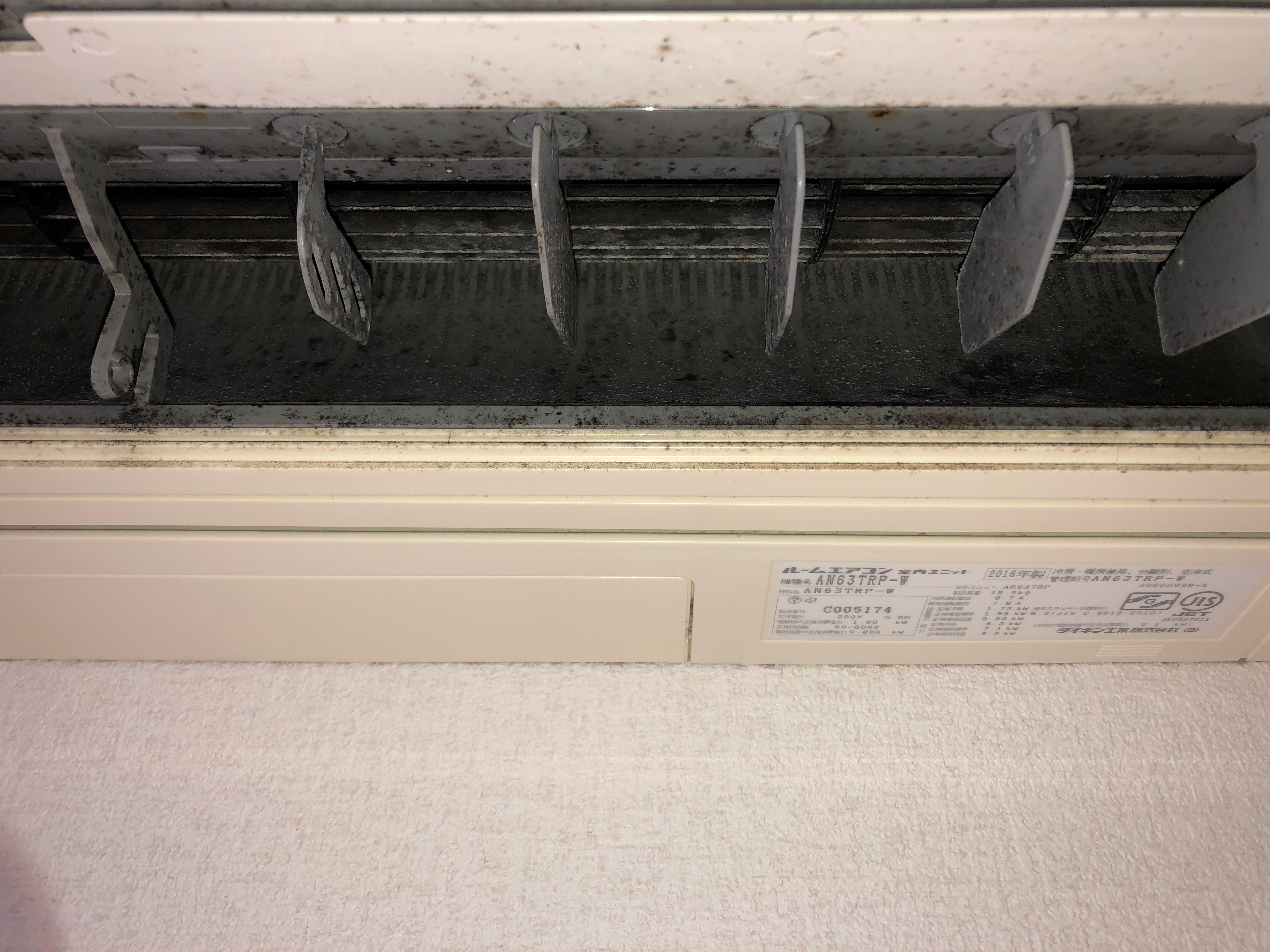 フィンや送風口に黒い汚れがびっしり……これはカビやホコリが溜まった証拠です。