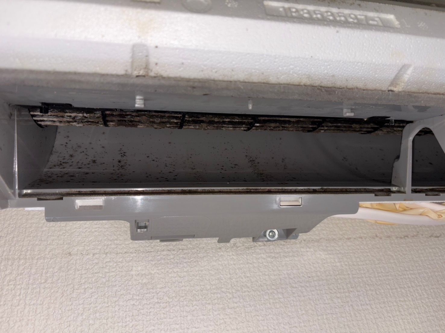 運転すると黒い塊が落ちてくるとのことで、内部を確認したところ、黒カビの塊が送風ファンにたくさん確認できました😱