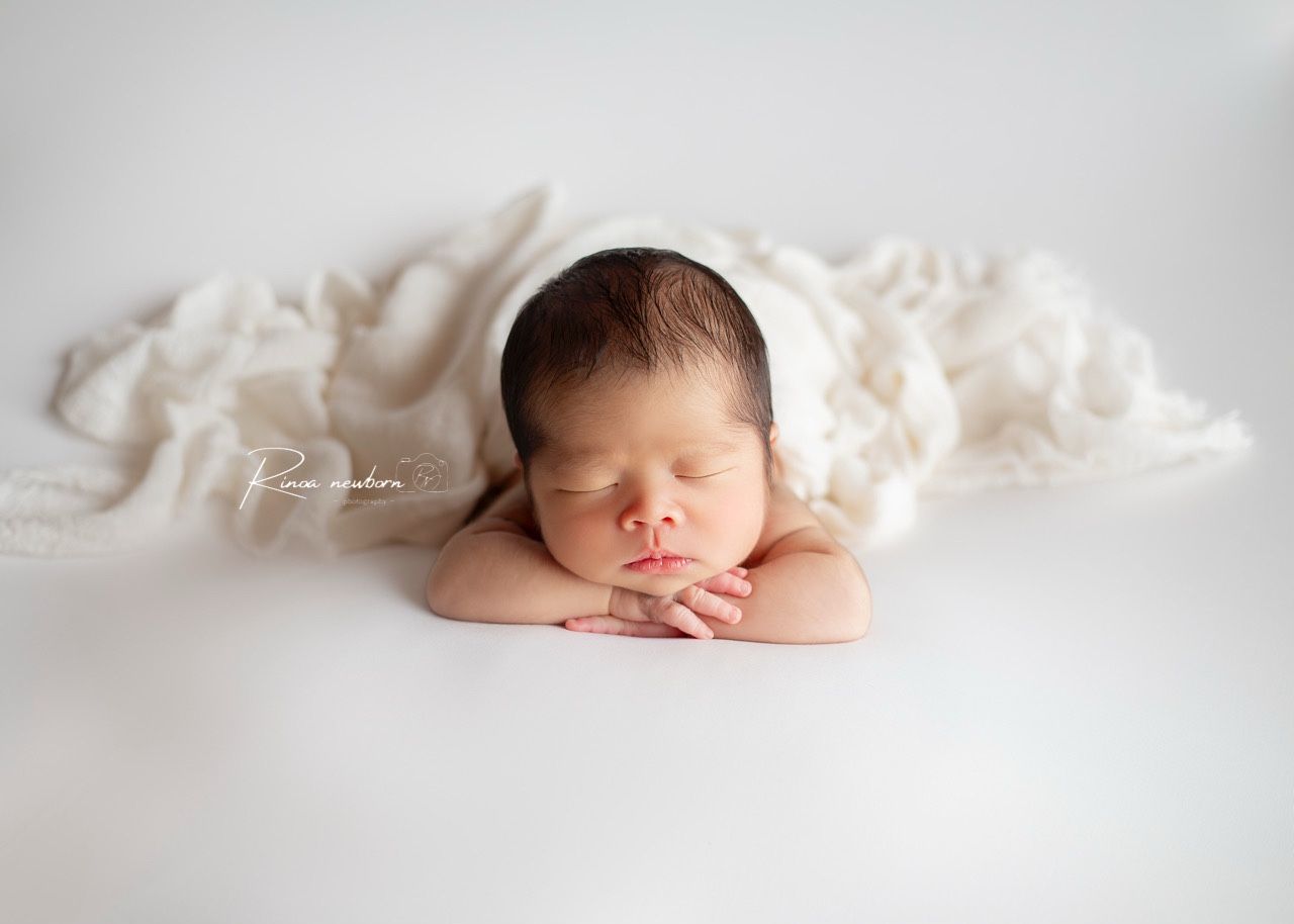 赤ちゃんをうつぶせに寝かせて、手の上にあごをちょこんと乗せるスタイル。シンプルながら表情がよく見えて、赤ちゃんらしい可愛さを引き立てるポーズです。