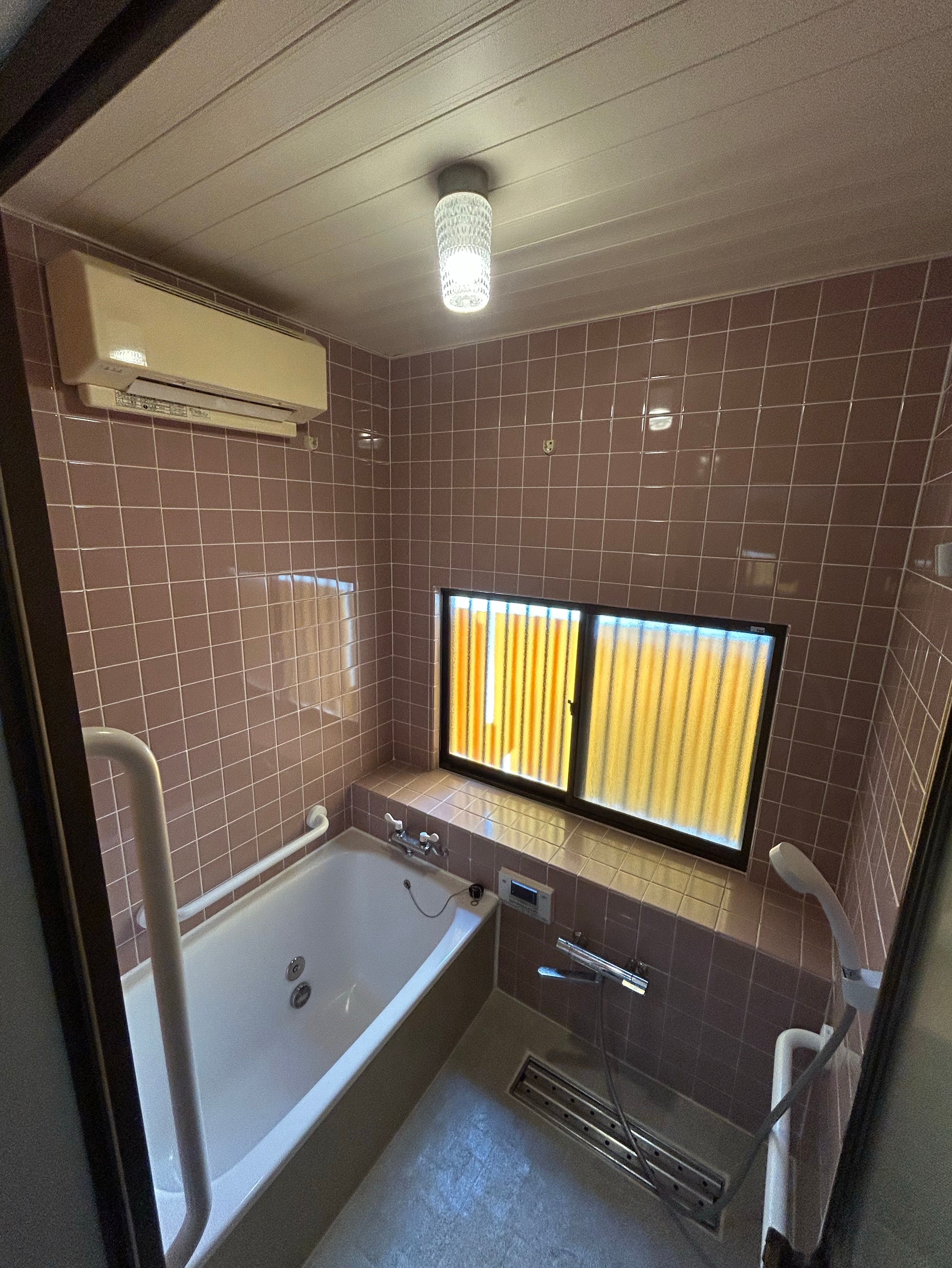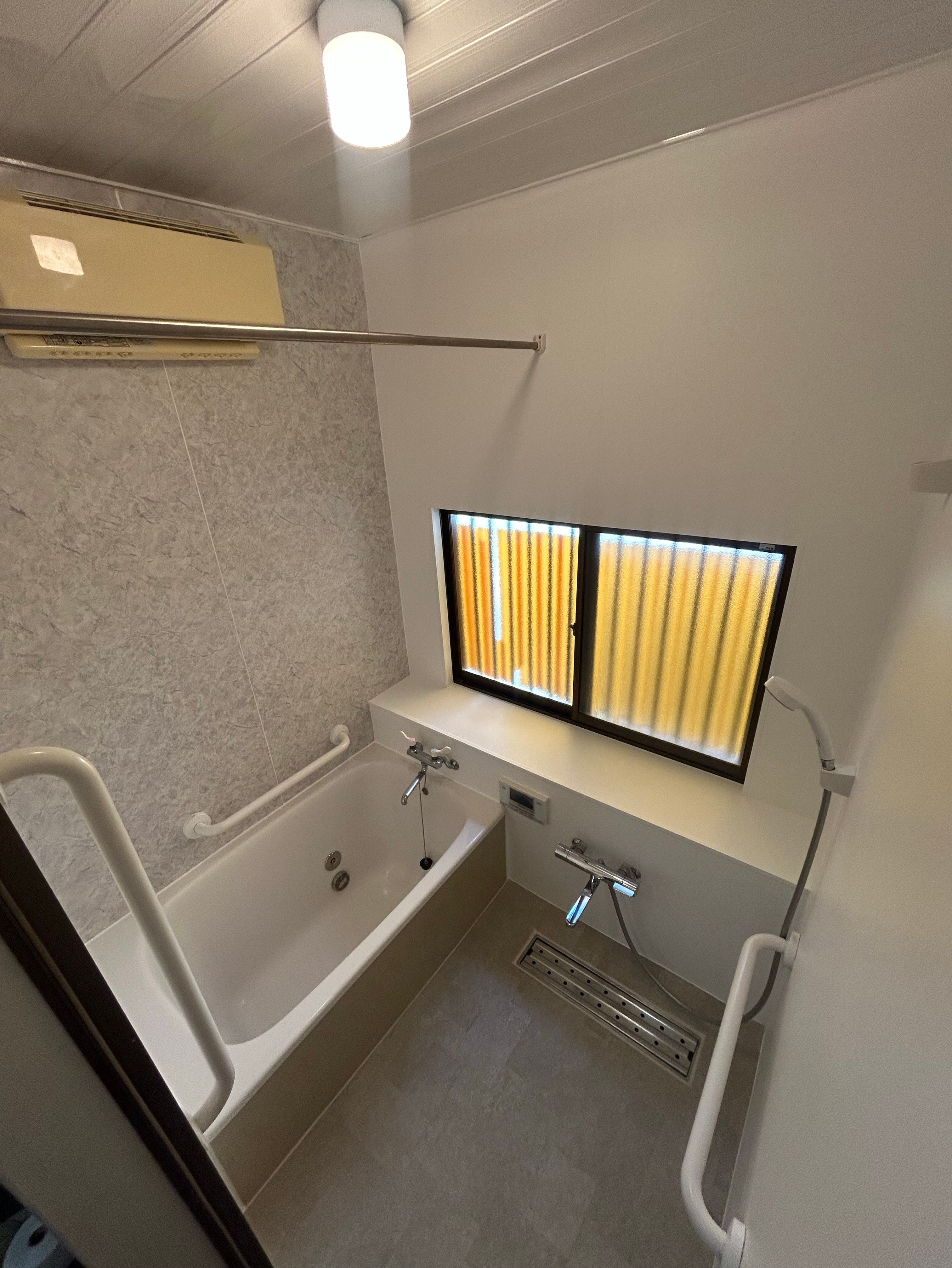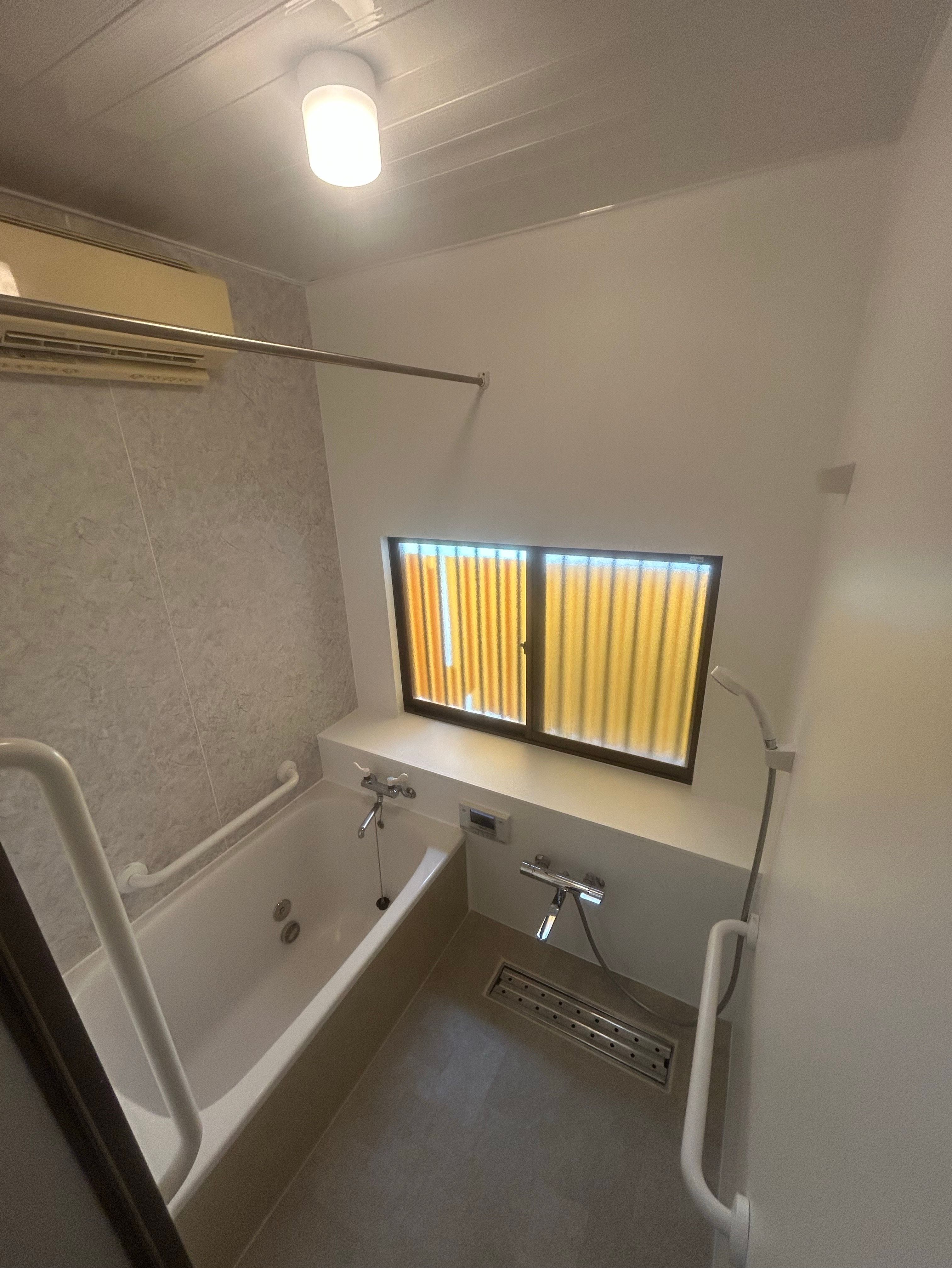 今回は在来浴室パネル貼り冷たく古く見える在来浴室一面アクセントにして浴槽 天井 ホワイト塗装上手くいきました✌︎('ω')✌︎