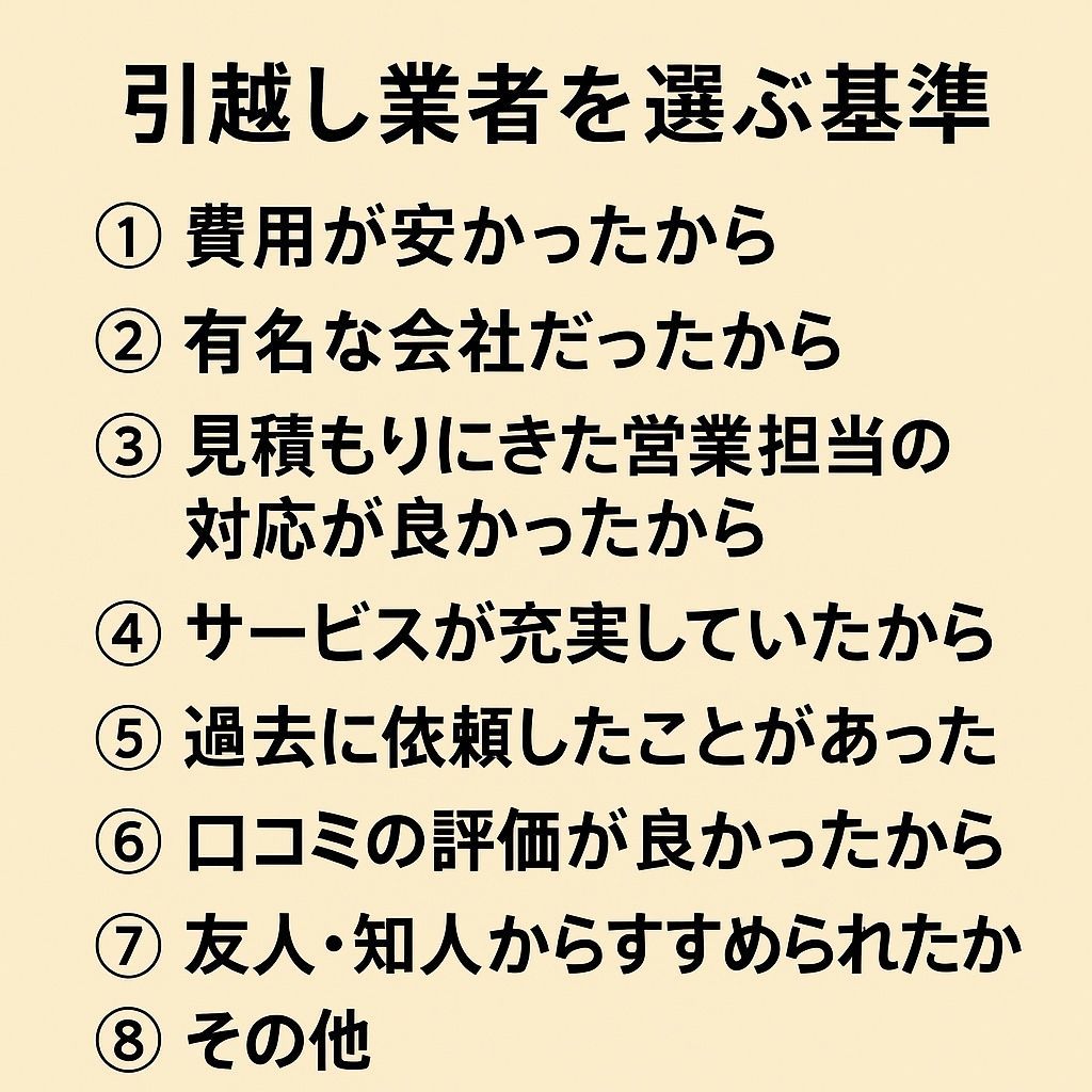 あるアンケートで引越し業者の選び方がランキングになっていました。(添付画像参照)