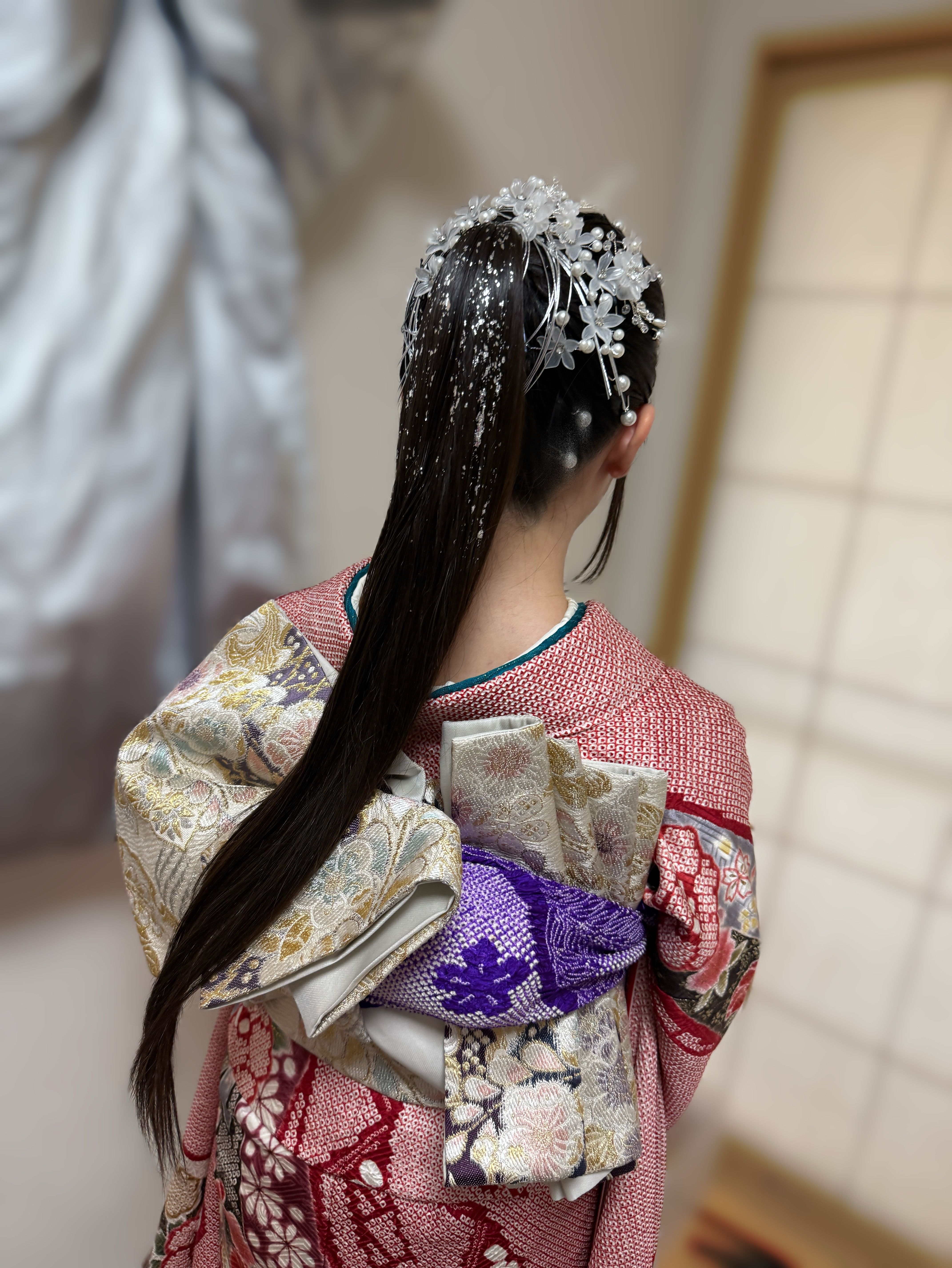 ゴージャスヘアセットで、ハイポニーテールをして、持参された銀箔や髪飾りをつけました。
