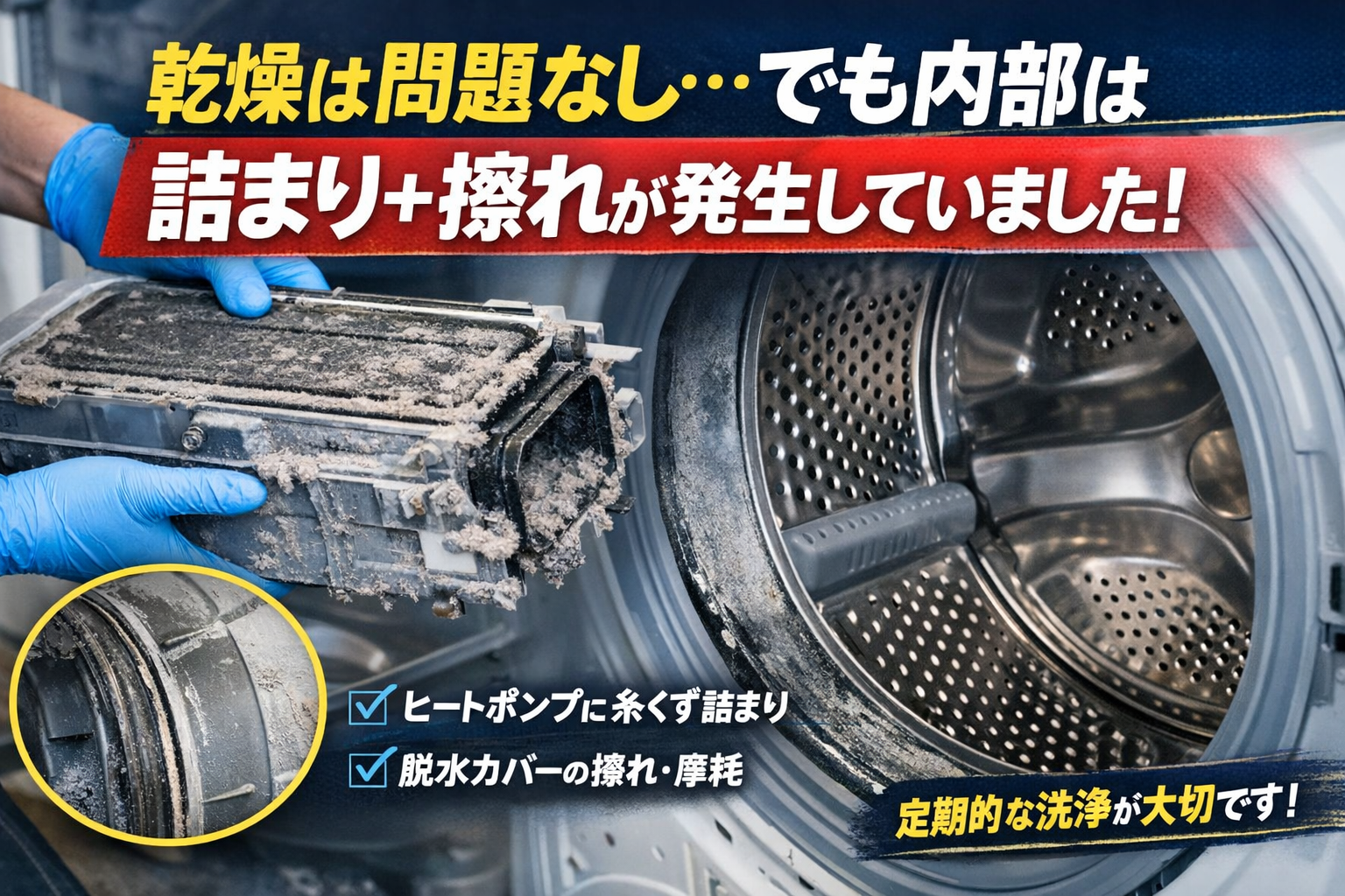 事前のヒアリングでは「乾燥時間は特に問題ない」とのことでしたが、分解して確認するとヒートポンプ内部に糸くずが詰まっており、乾燥効率が低下している可能性がある状態でした。