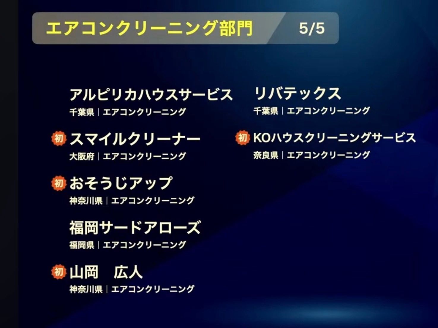 エアコンクリーニング部門約3700店舗中67店舗がノミネートされ15店舗ずつ発表されましたが最後の最後で福岡サードアローズが呼ばれてチョー焦りましたー