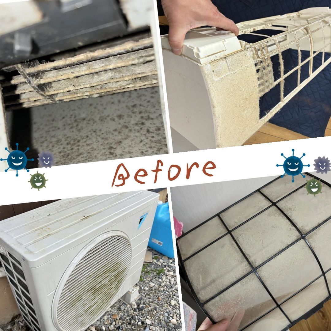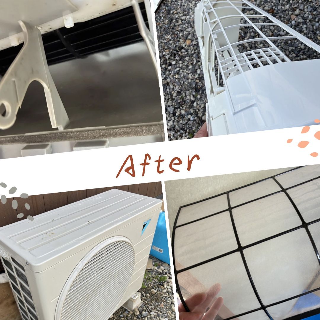 キッチン付近のついているエアコン。油汚れが入り込みやすく、内部や外部は油汚れがつきやすくなります。何度も繰り返し洗浄し、キレイに。ありがとうございました♪