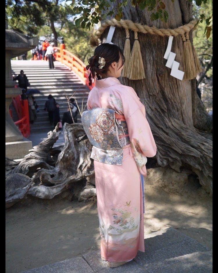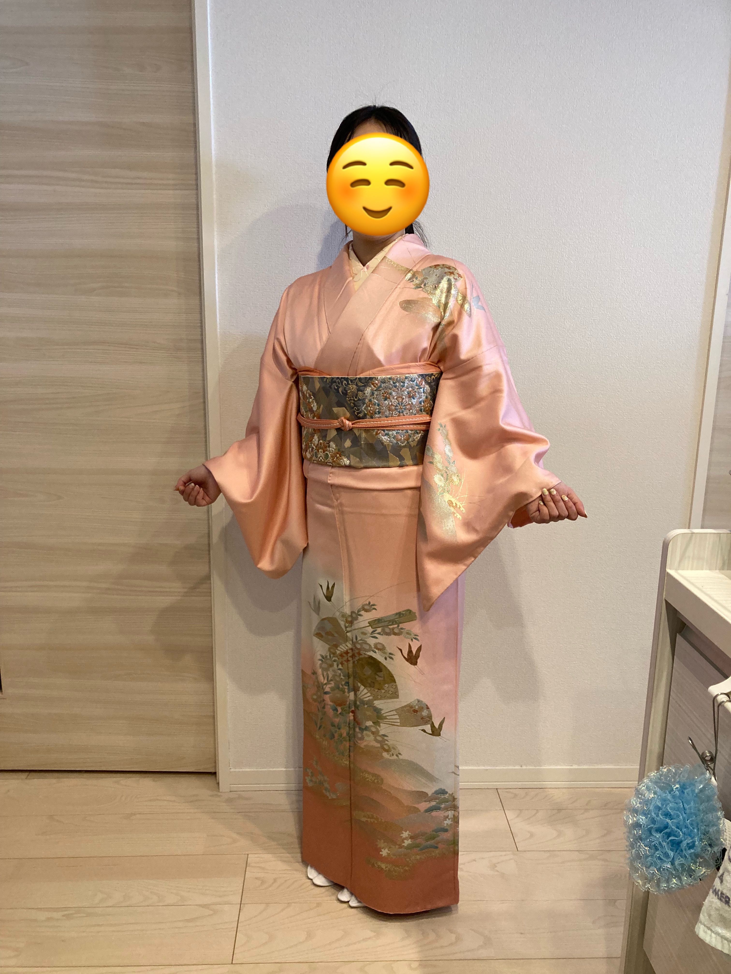 今回、着られた花扇の描かれたピンクのお着物♡グレー地で花刺繍の帯とのコーディネートよくお似合いでした✨✨