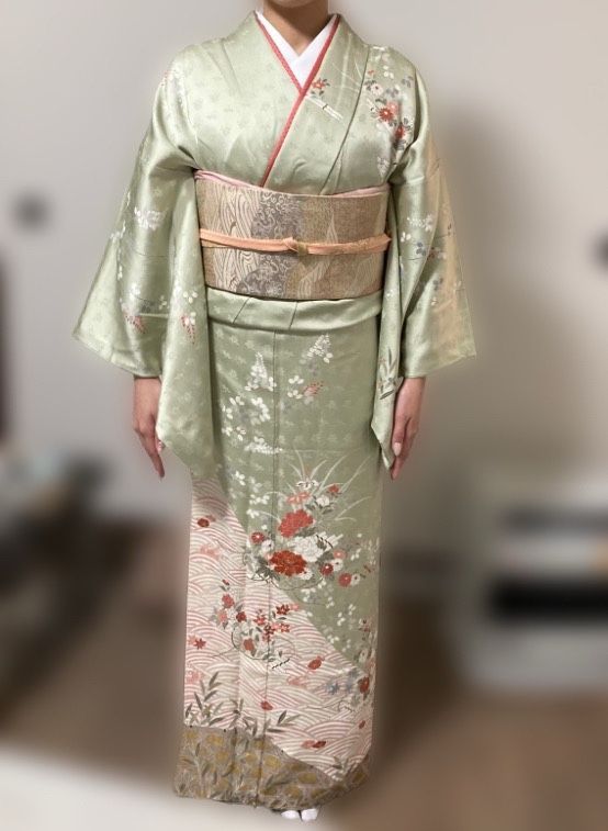 淡いグリーンのお着物のお花の色と同じ赤い重ね襟がアクセントになっていてとても素敵なコーディネート💓よくお似合いでした✨✨