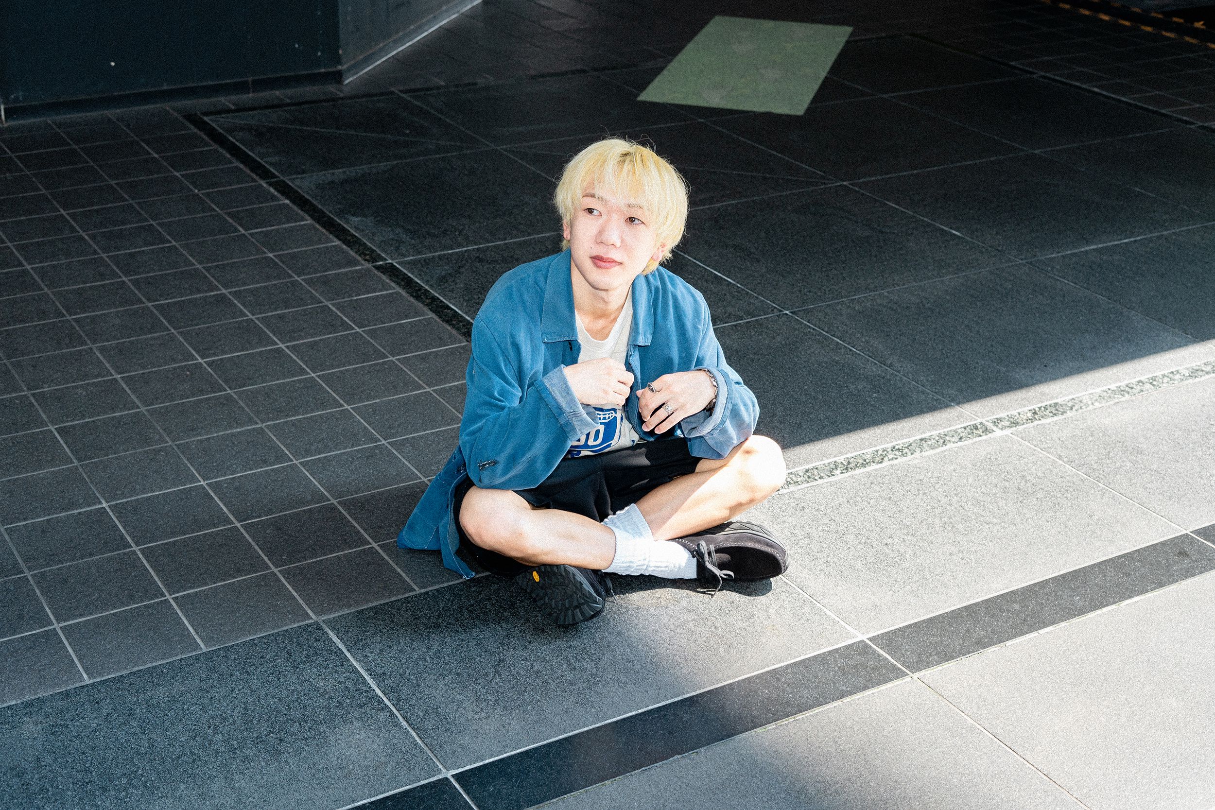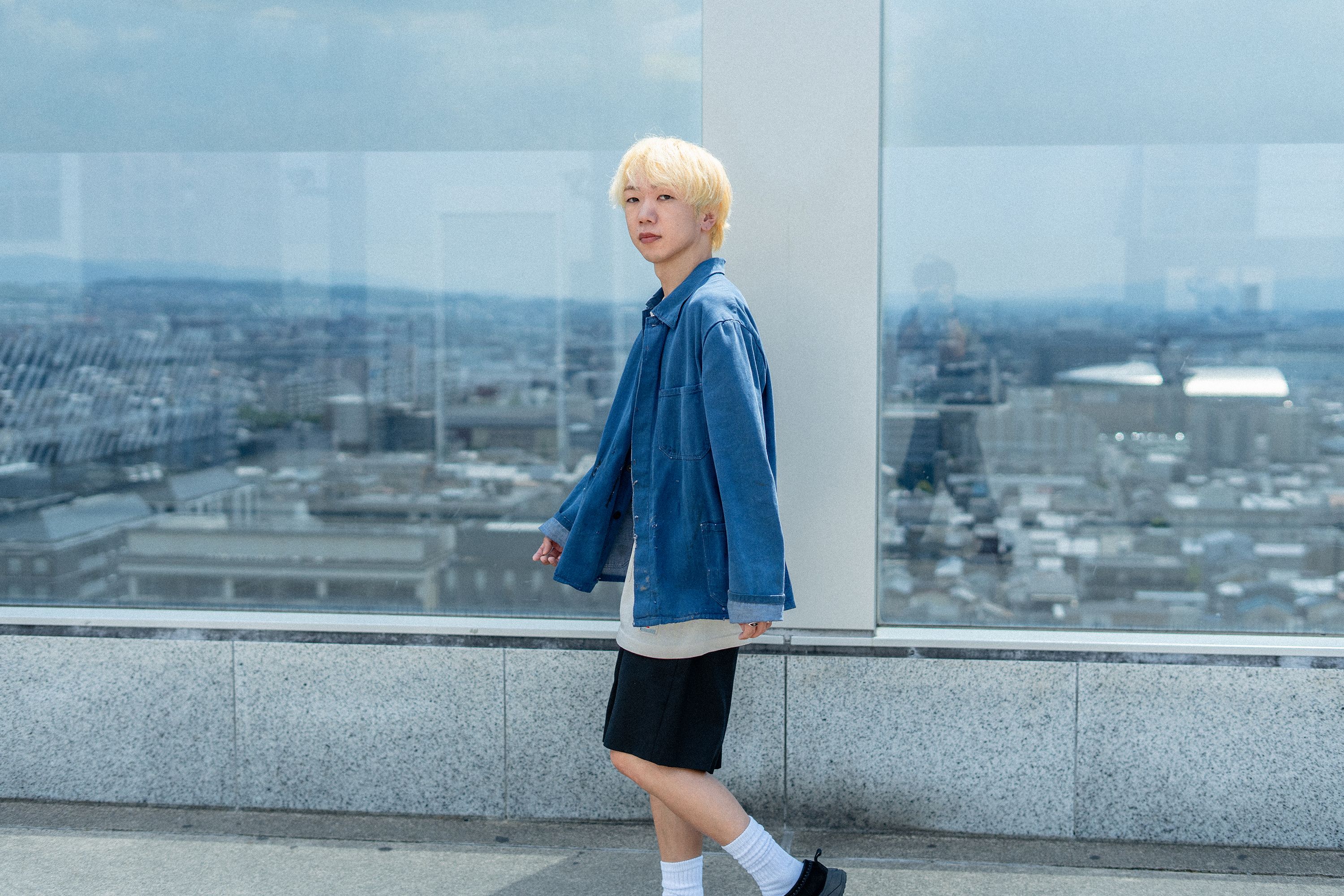 ハイトーンのヘアとデニムシャツに端正な顔立ちが京都駅の素敵なロケーションにバッチリでした!