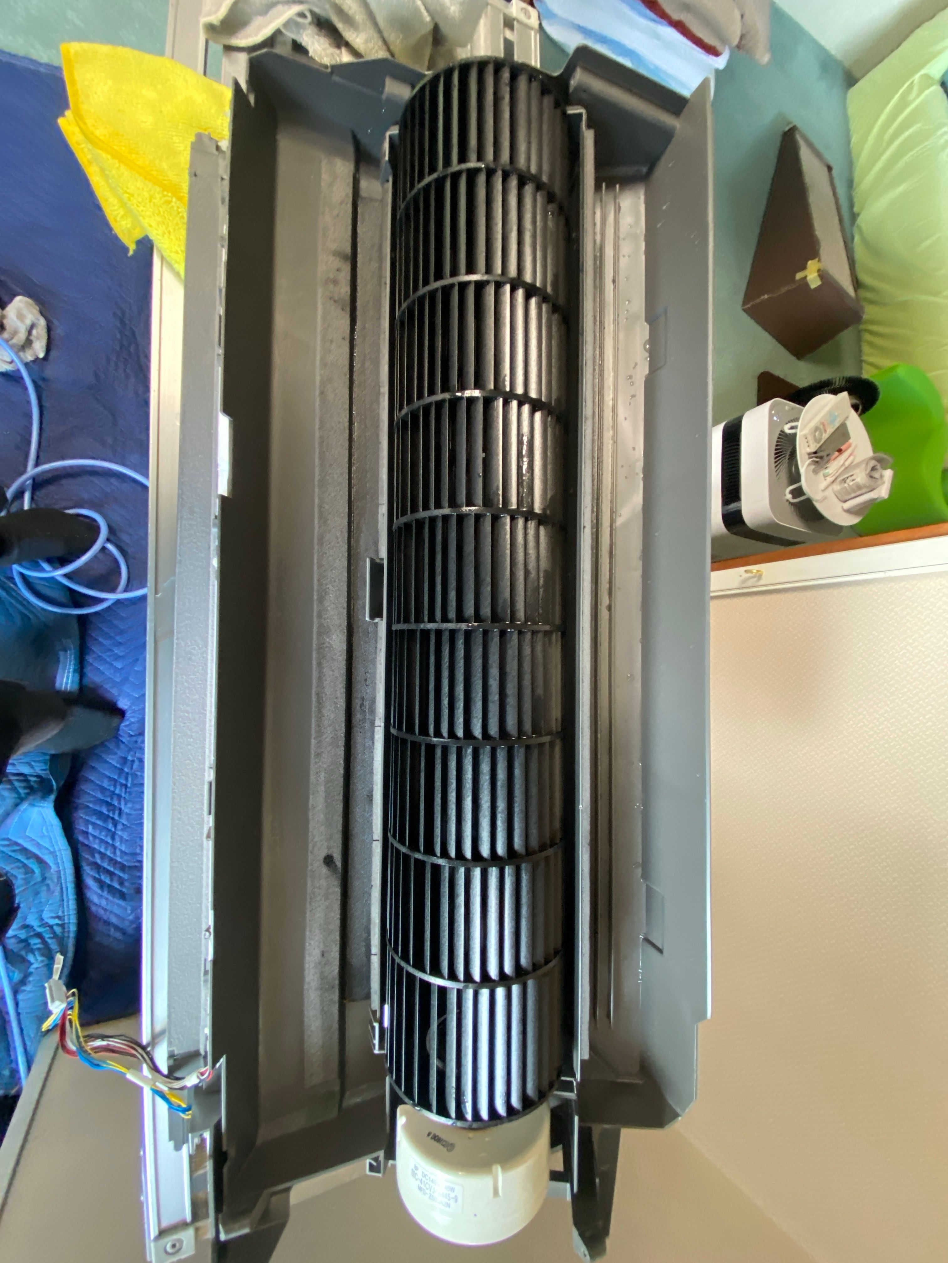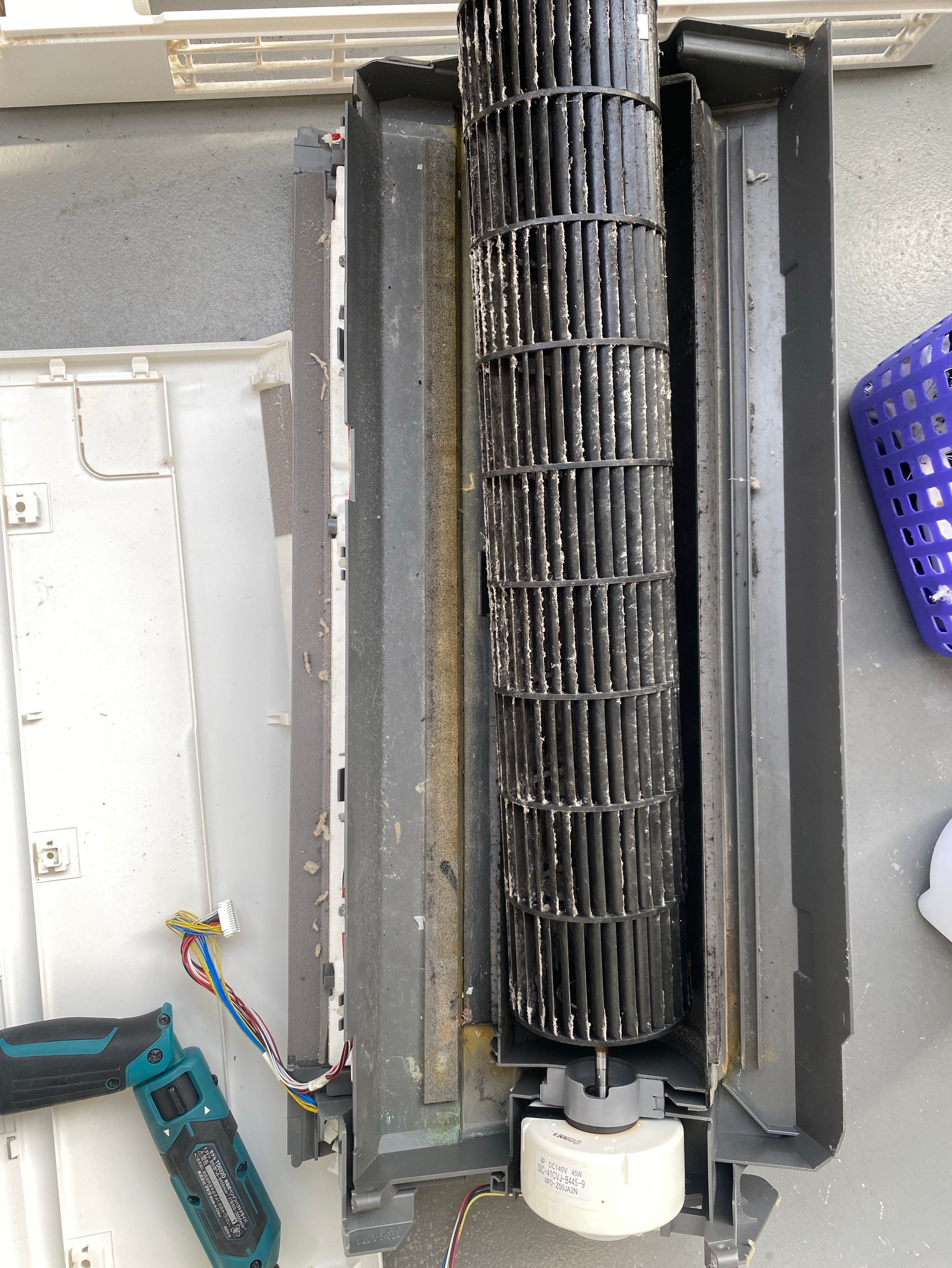 富士通ノクリアの完全分解を実施しました。通常分解では手が届かないドレンパンの背板まで100%洗浄が出来ます。※ただし、ポンプダウンを伴う作業は行っておりません。一部背抜き分解せずに洗浄する機種もありますのでご了承ください。Before