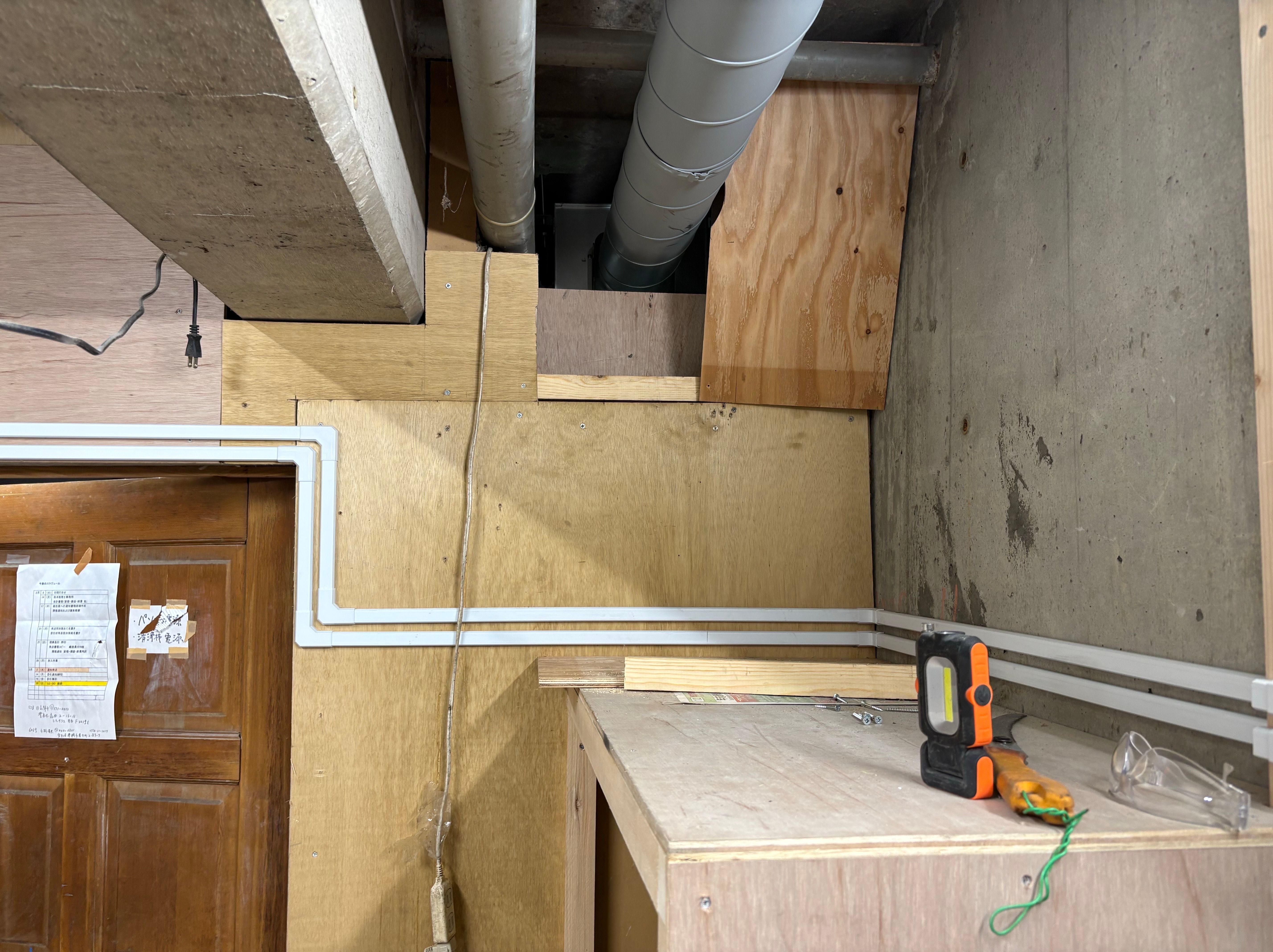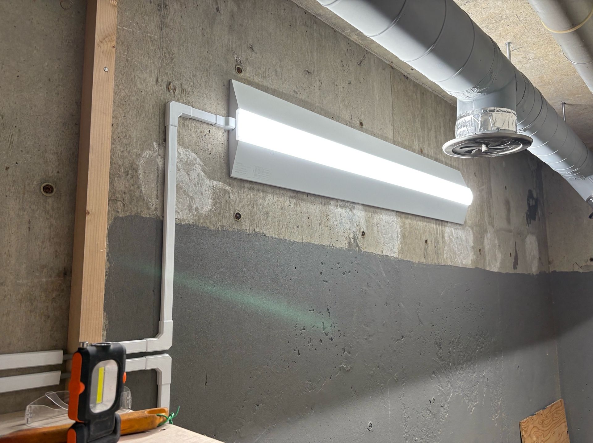 壁面がコンクリート構造のため、配線ルートの一部は モール施工 により美観を確保しております。