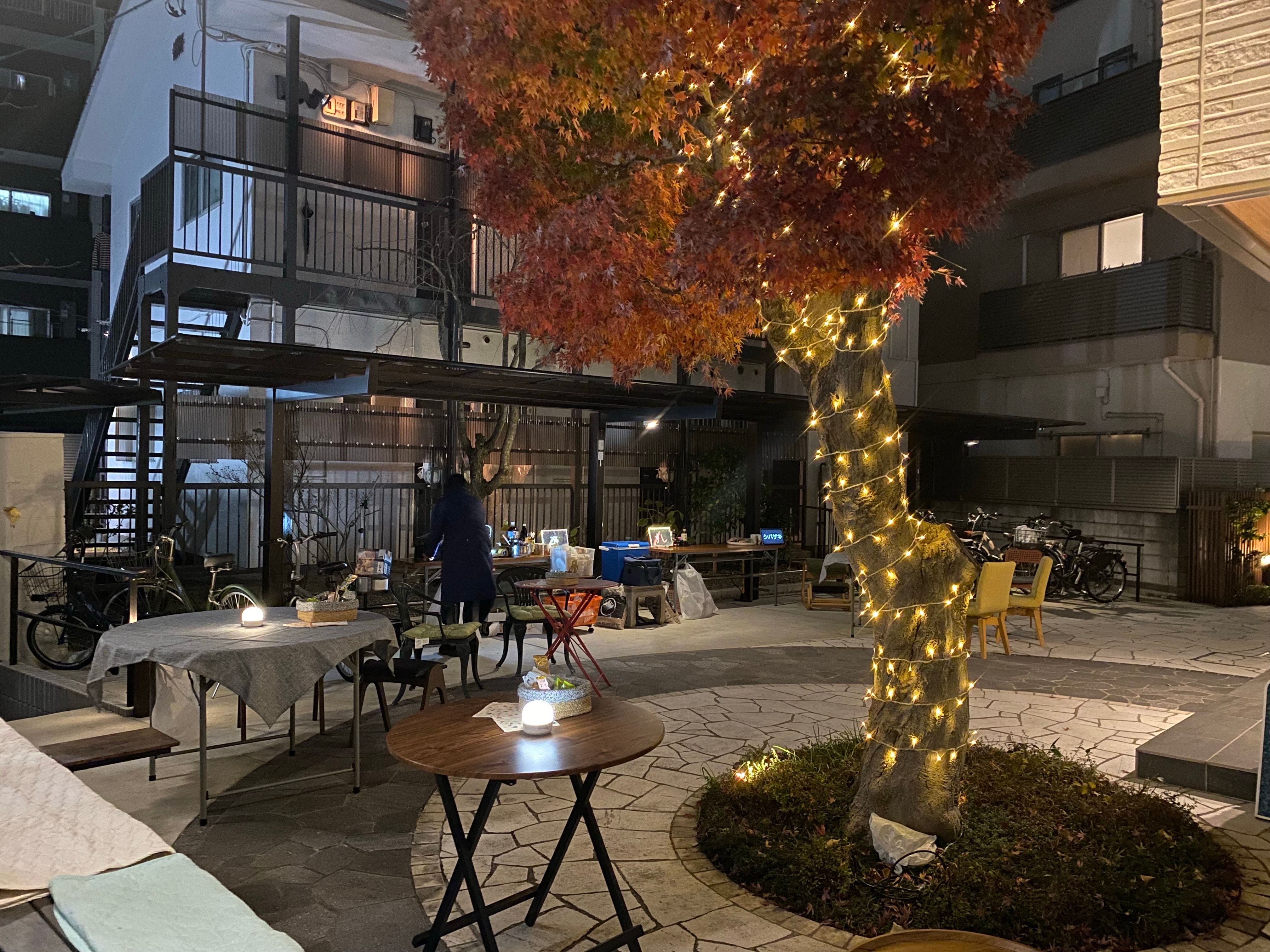 イルミネーションが灯る夜の中庭に、焚き火のあたたかさと、目の前で起こる不思議なマジック