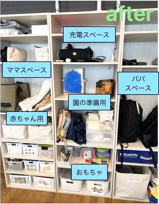 そこで、収納棚の低い場所は子供ゾーンへ、高い場所は大人ゾーンへ分けることにしました。