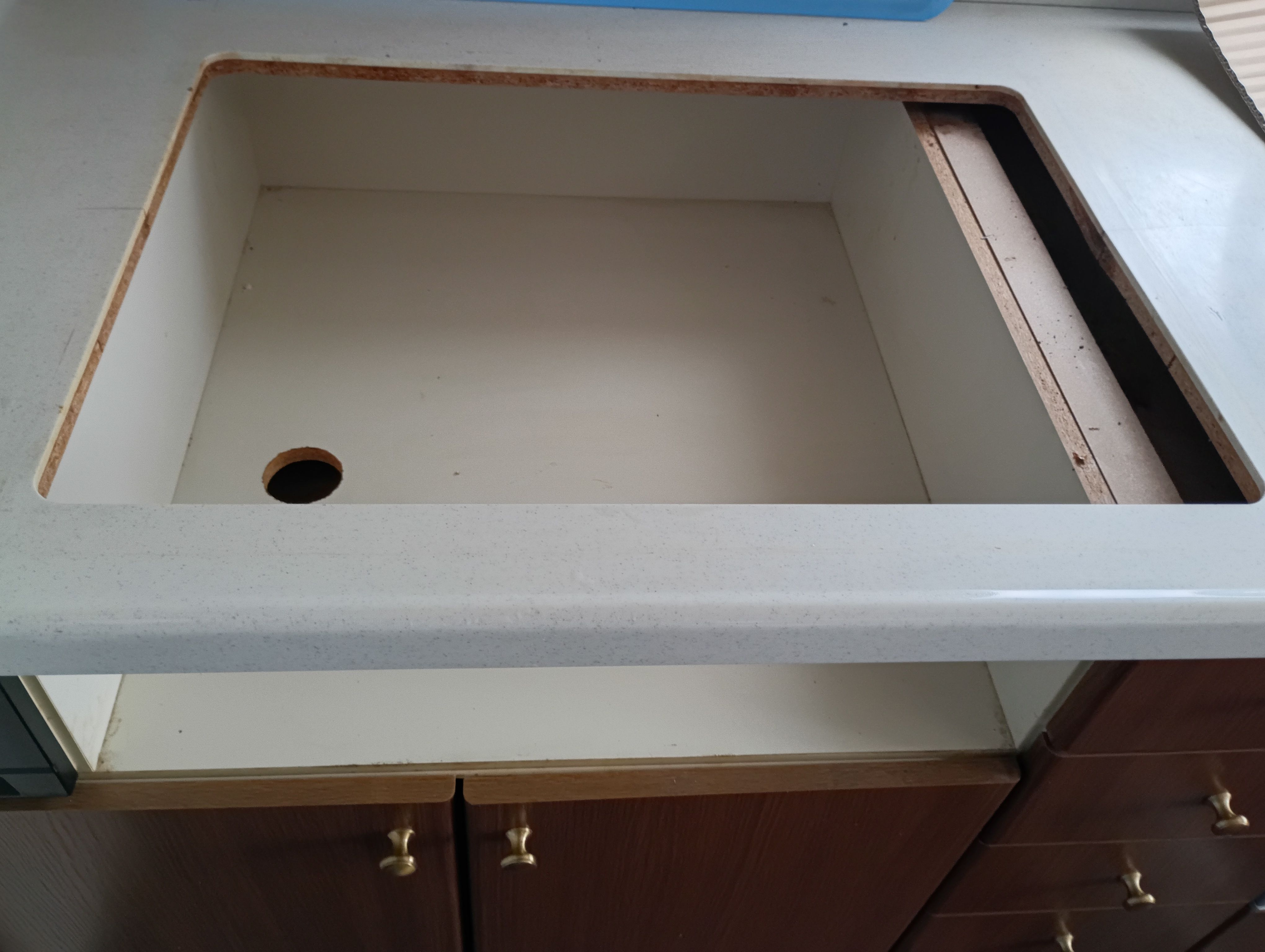 今付いているコンロは特殊なサイズの物でしたので、コンロを外した後、現行品に合うように間口を調整する部材を取付ます。