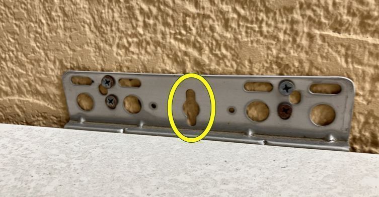 給湯器の上部固定ネジですが、黄色の丸印の中に、固定ネジがありません。