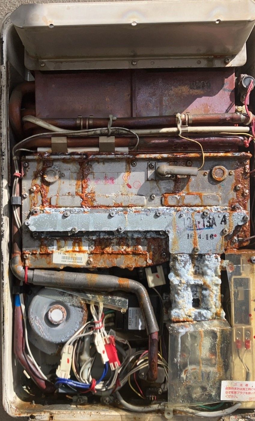 なぜ穴が開くかというと、ほぼ「経年劣化」が原因ですが水道に不純物が入っていて熱交換機部分に付着して銅管部分を腐食させてしまうのです。