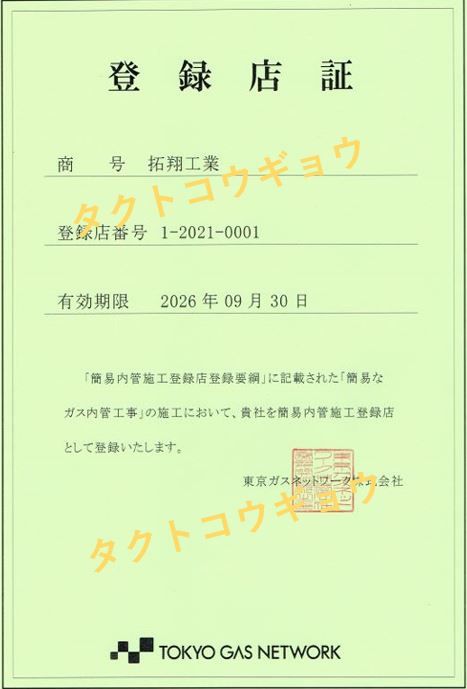 あなたの町のガス屋さん!「業歴27年」都市ガス・LPG工事可能!東京ガス簡易内管施工店です。