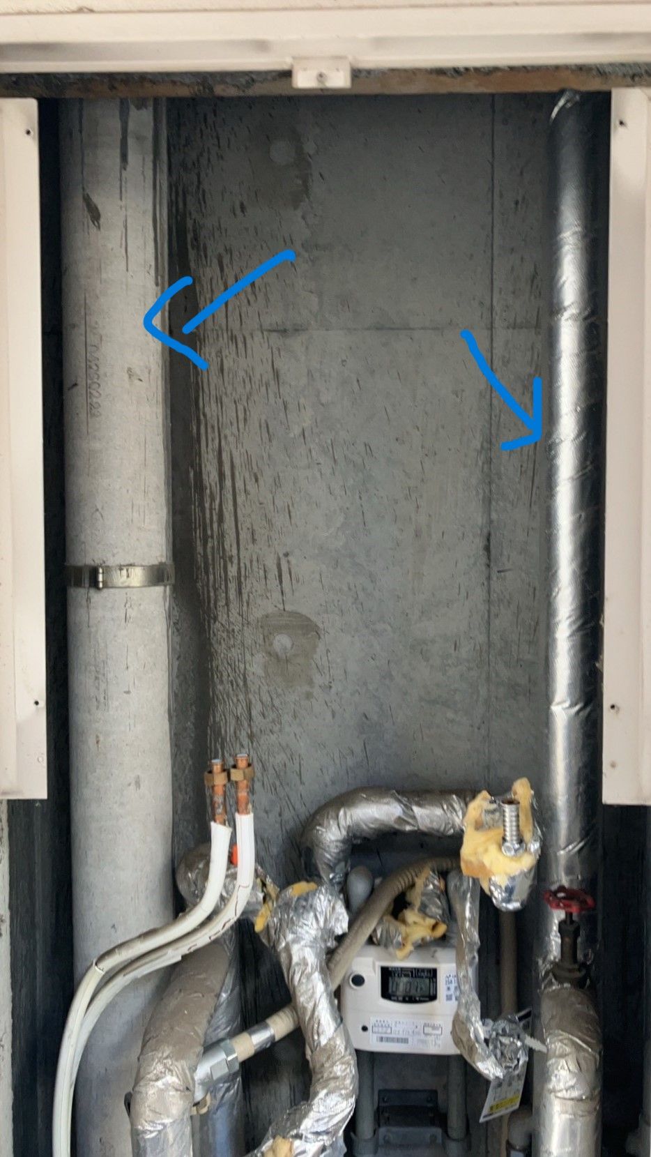 こちらは、PS設置の給湯器を外した画像で青い矢印に配管があります。