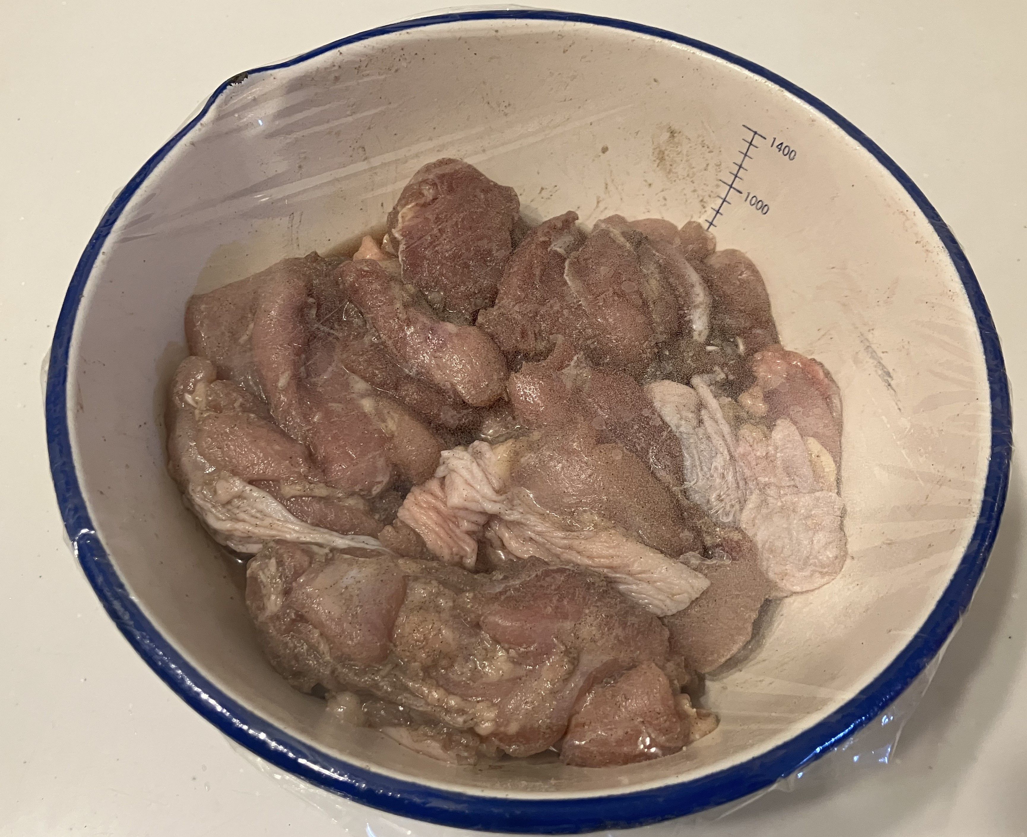 ①妻にとり肉のトリミング(スジとか軟骨など取る)してもらい、1枚を4等分にカット。