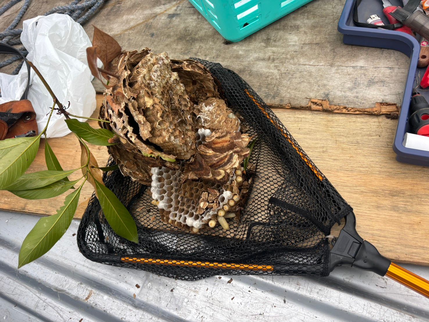 「小学校の校門前にある駐車場の植え込みにスズメバチの巣がある」とのご連絡を受け、児童の安全を最優先に緊急対応いたしました。 最短日程で駆除スケジュールを調整し、下校時刻後に作業を実施。人通りの多い場所でも、安全対策を徹底したうえで、迅速かつ確実に駆除を完了しました。