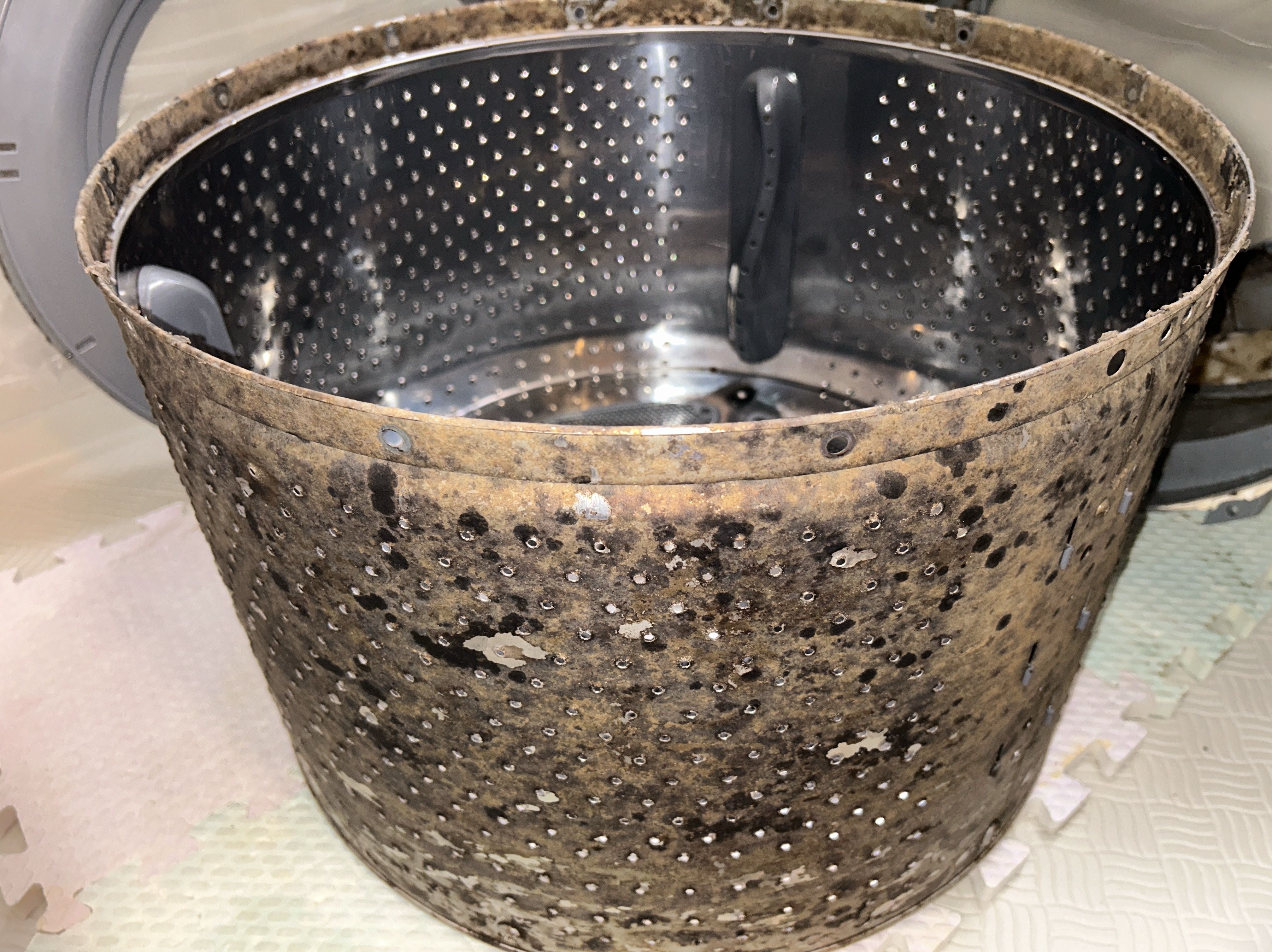 ドラム式洗濯機の場合は乾燥を使っていればそれほど内部にカビは生えない傾向になりますが、こちらの機種は乾燥があまり効いていない影響で、洗濯槽もかなり汚れていました。