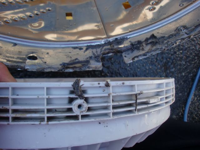 2016年製ですが 黒かびは少なめですが、ヘドロ臭がきつく 細部まで汚れを除去しないと この手の匂いは大収まりませんので、一番のネックである 洗濯槽下部の容器 ステンレスの筒がカシメてあり 通常 外すことはできませんが 匂いの元がその奥にあるため 今回は自社の中古販売品なので 工具を使ってカシメ部分を起こして