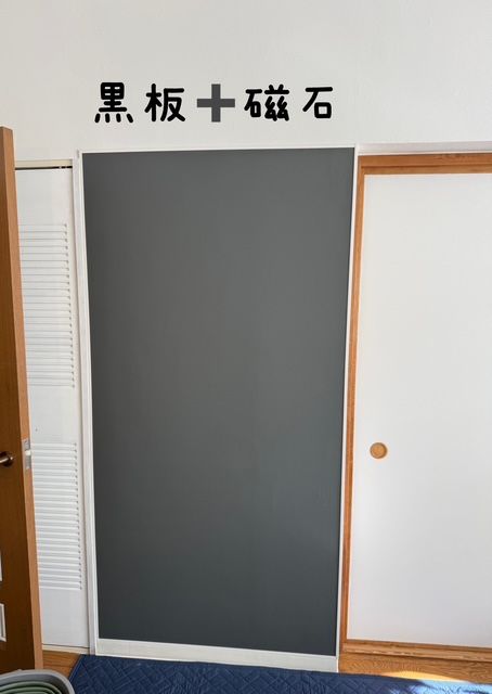 今回は、お部屋の壁一面にマグネット下地を施工し、その上から黒板のようにチョークで文字や絵が書ける「掲示板クロス」を施工しました。