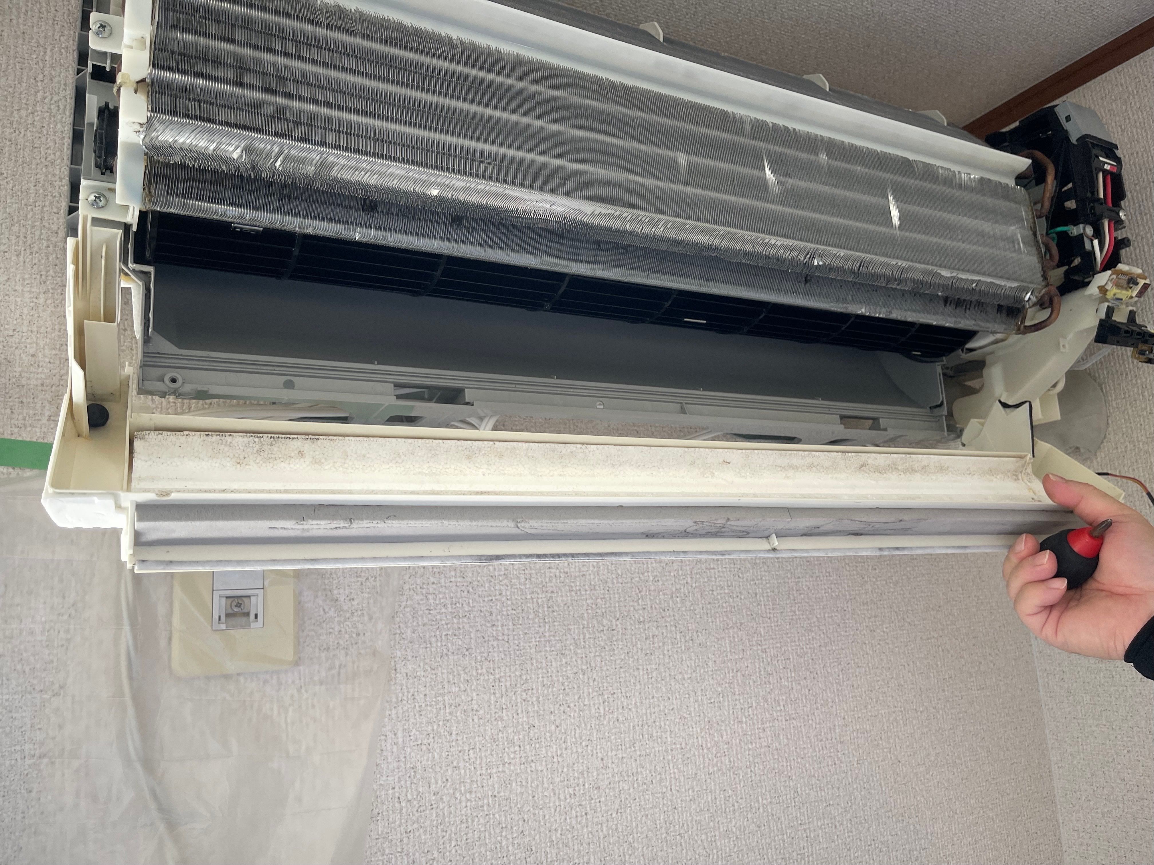 ドレン板のなかまでしっかりカビも溜まり、送風ファンにもカビがたくさんついていたので、臭いもしっかりありました。