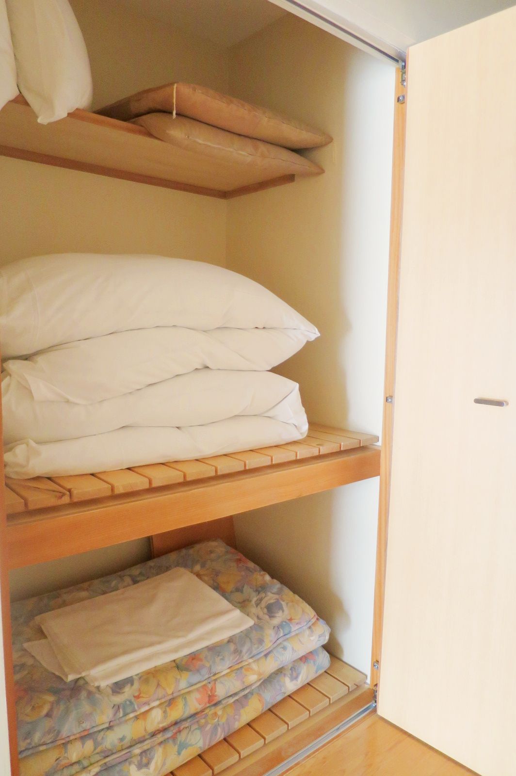 収納スペースには、余裕を持たせて8割程度の収納を意識するのがポイント。風の通り道をつくることで湿気対策になります。