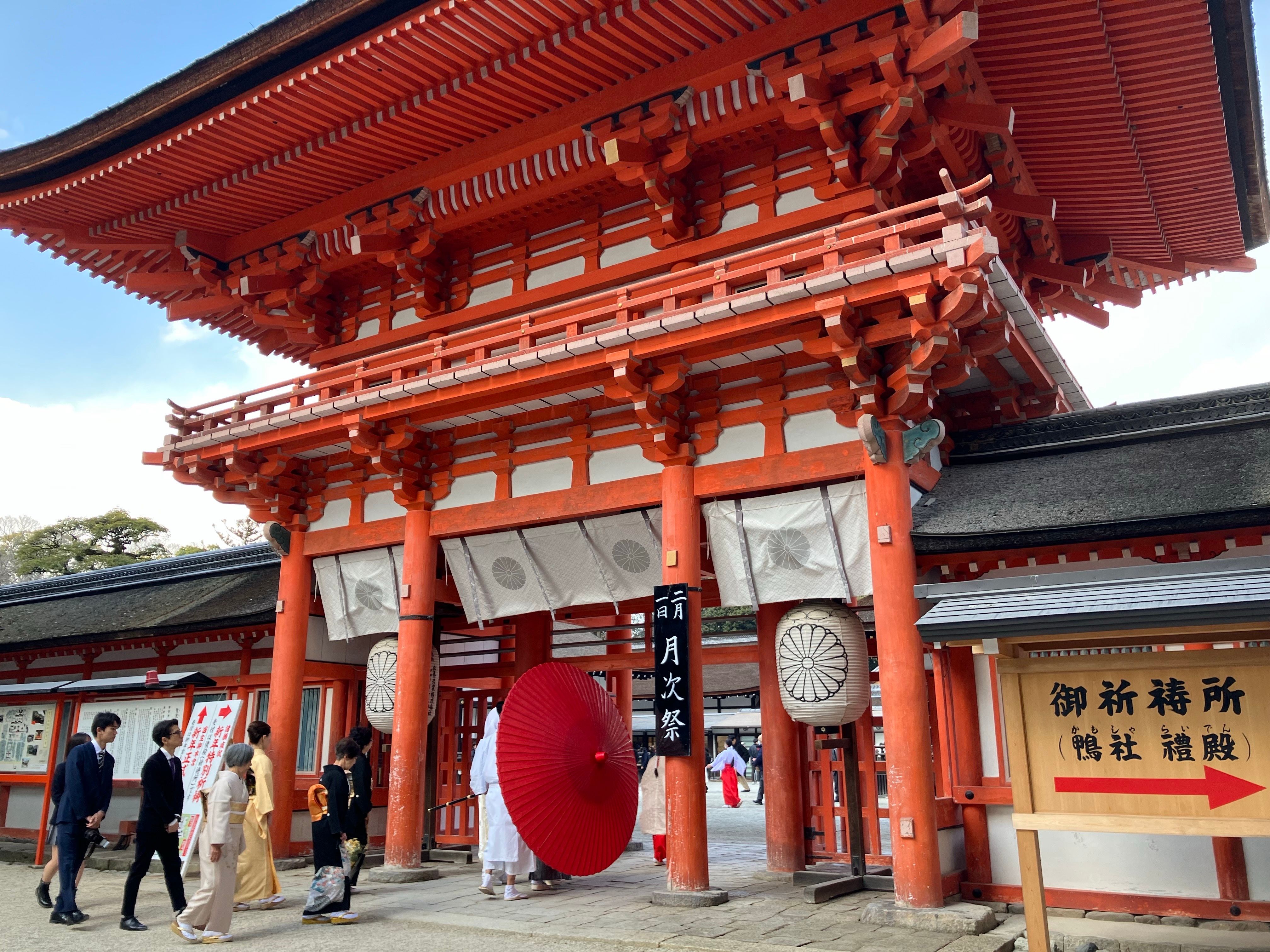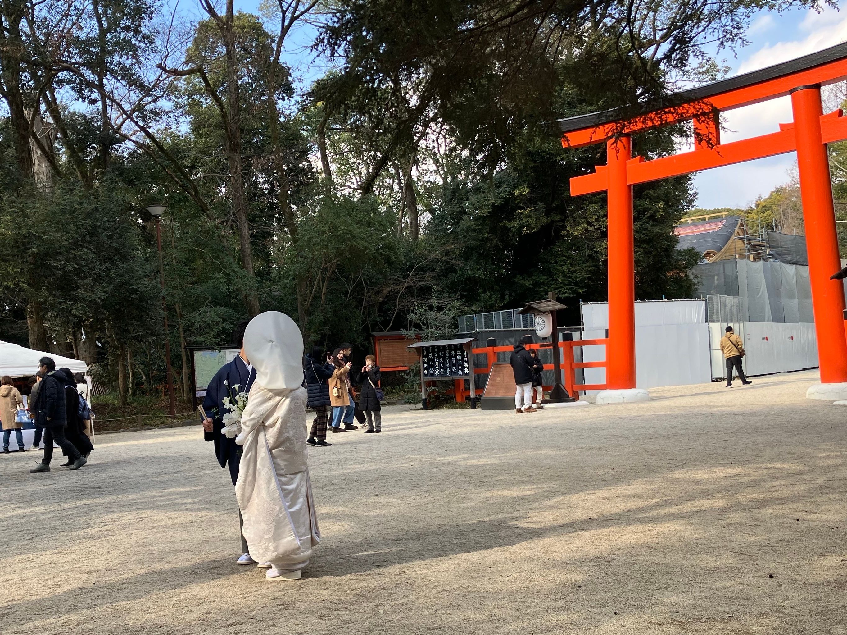 由緒ある神社、おごそかな雰囲気の中ゆっくりと進む花嫁行列。初詣の参拝客からも盛大な祝福があります。