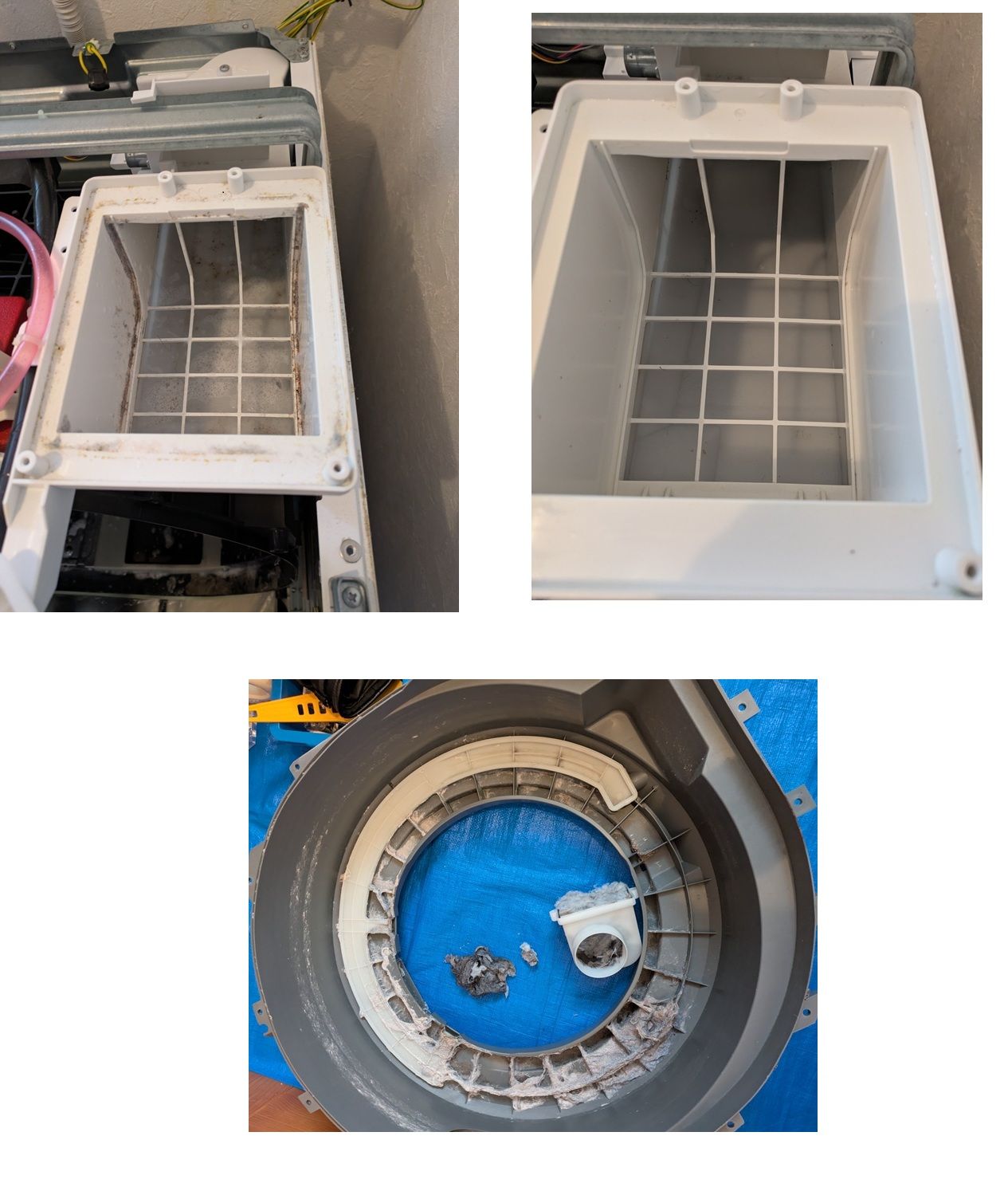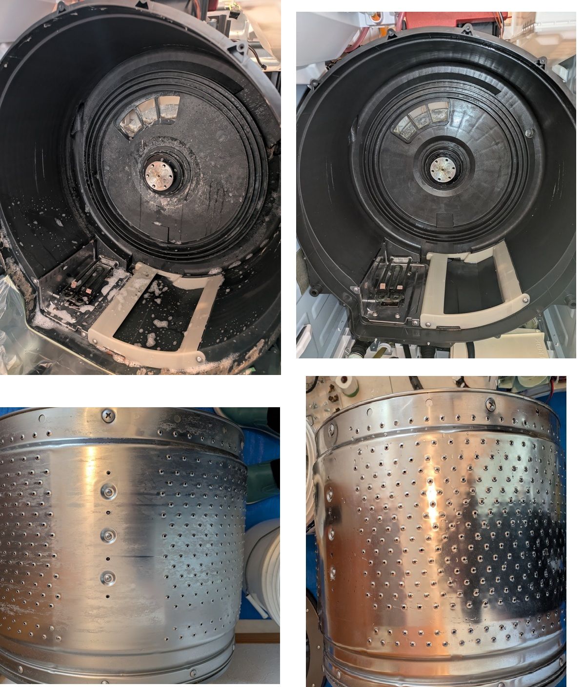 分解してみると、ダクトやドラムカバーの裏にホコリが付着しておりました。洗濯槽もくすんでおりましたが、清掃後はピカピカになりました。