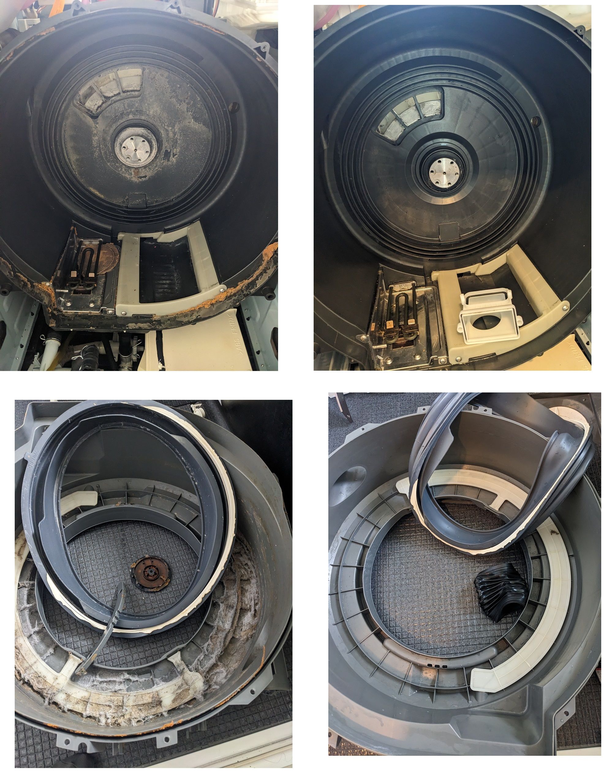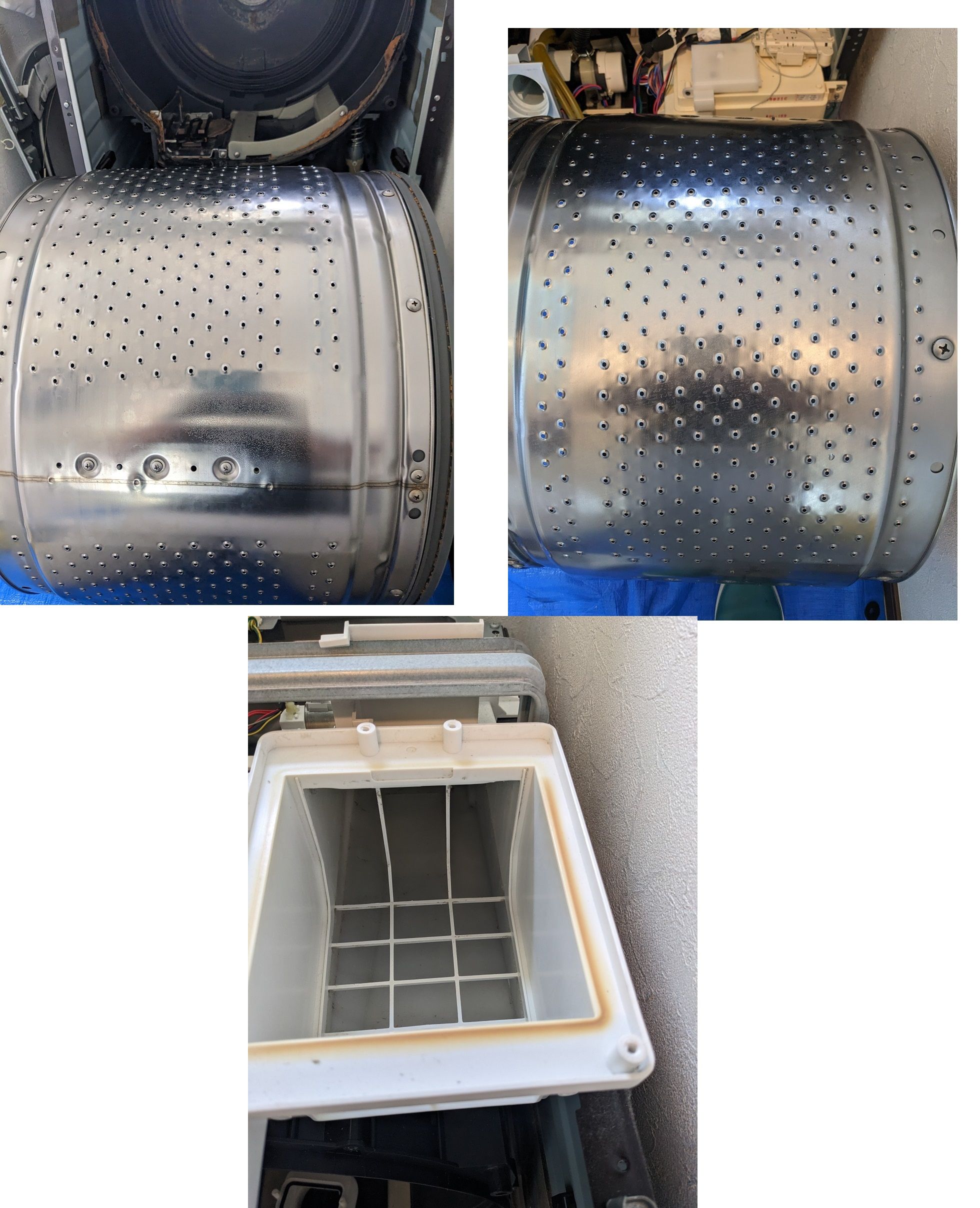 分解してみると案の定、ドラムカバーの裏にホコリが付着しておりました。洗濯槽もくすんでおりましたが、清掃後はピカピカ✨なりました。