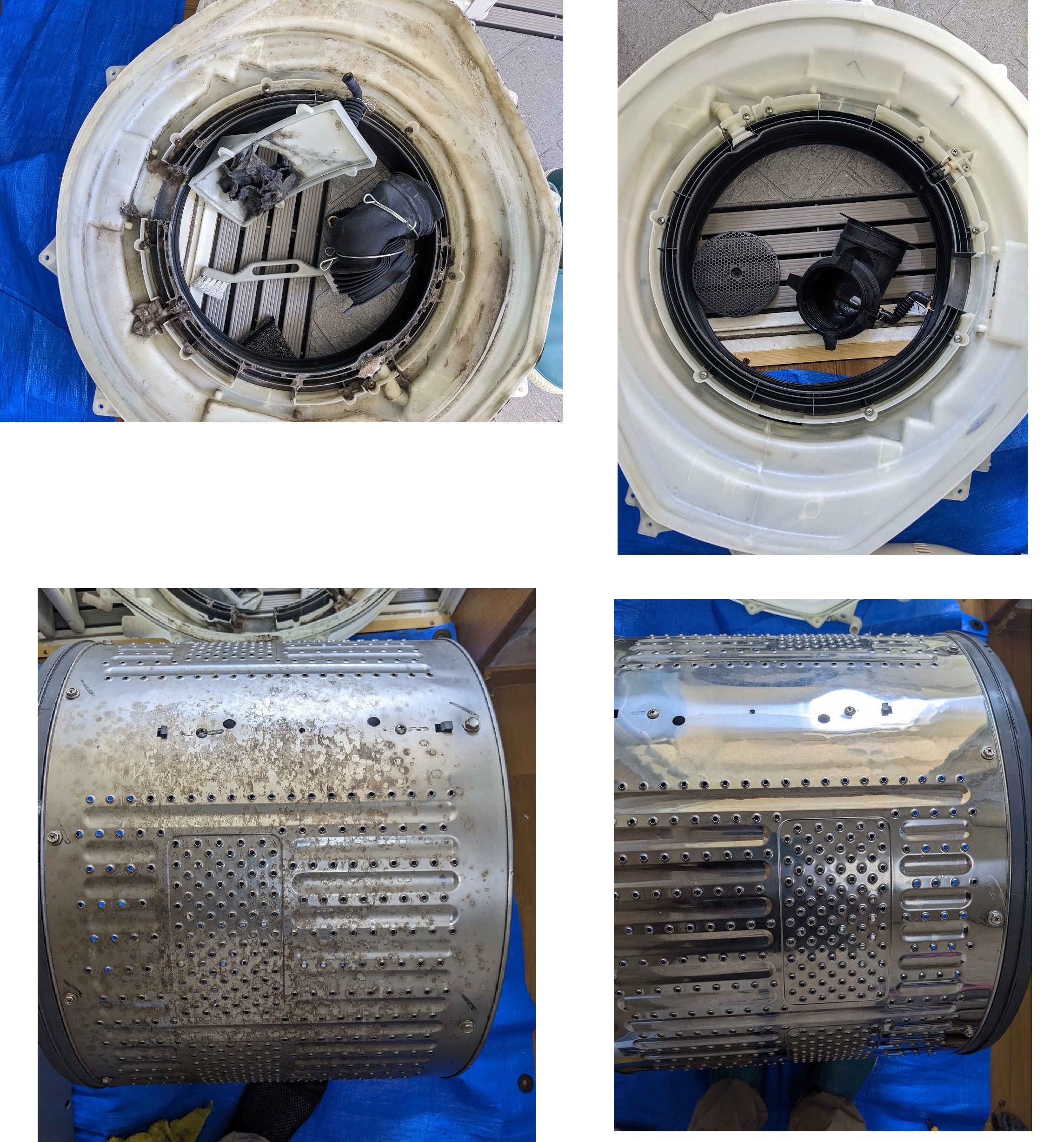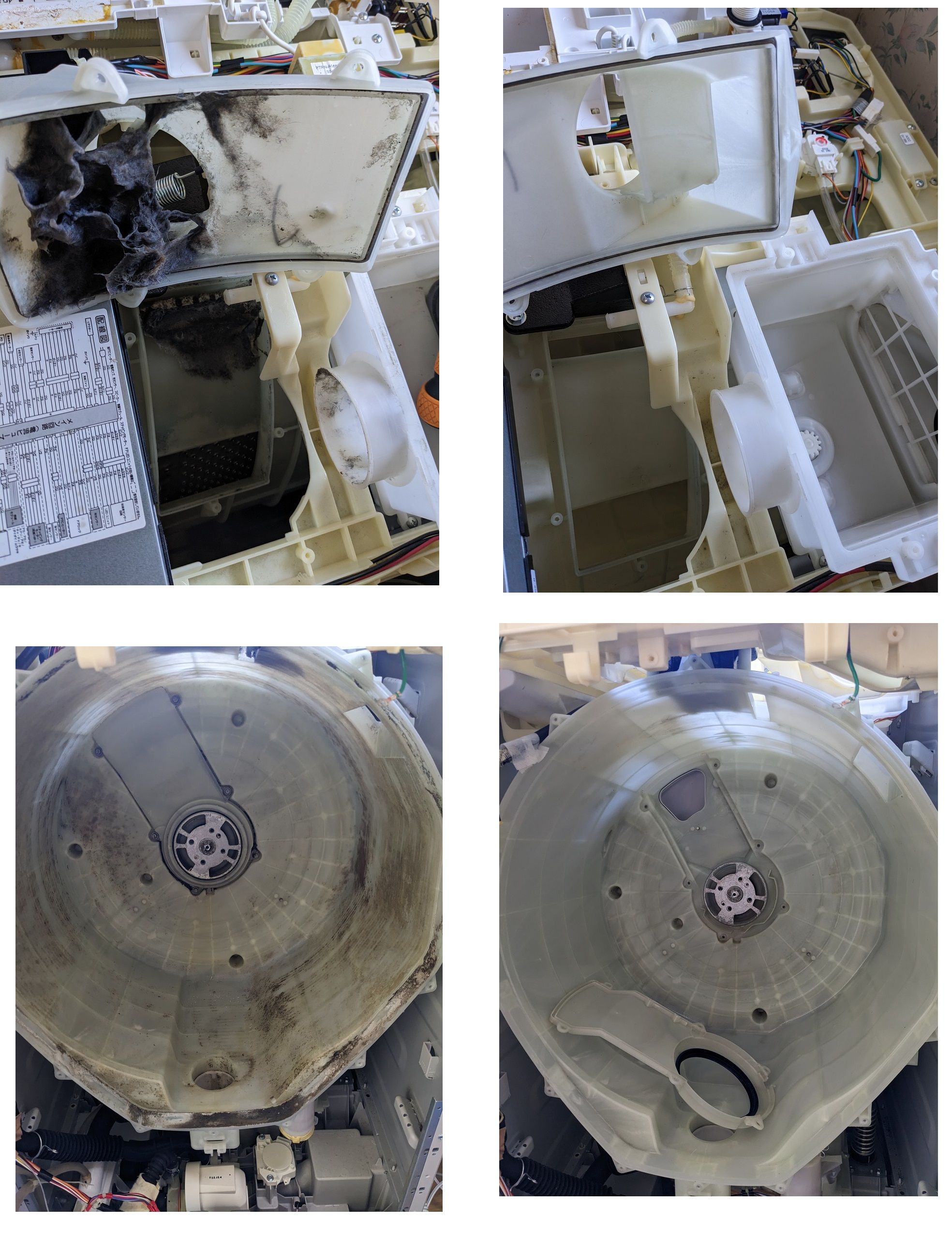 分解してみると洗濯槽の外側には黒カビが付着しており、カバーの内側にはホコリが溜まってました。