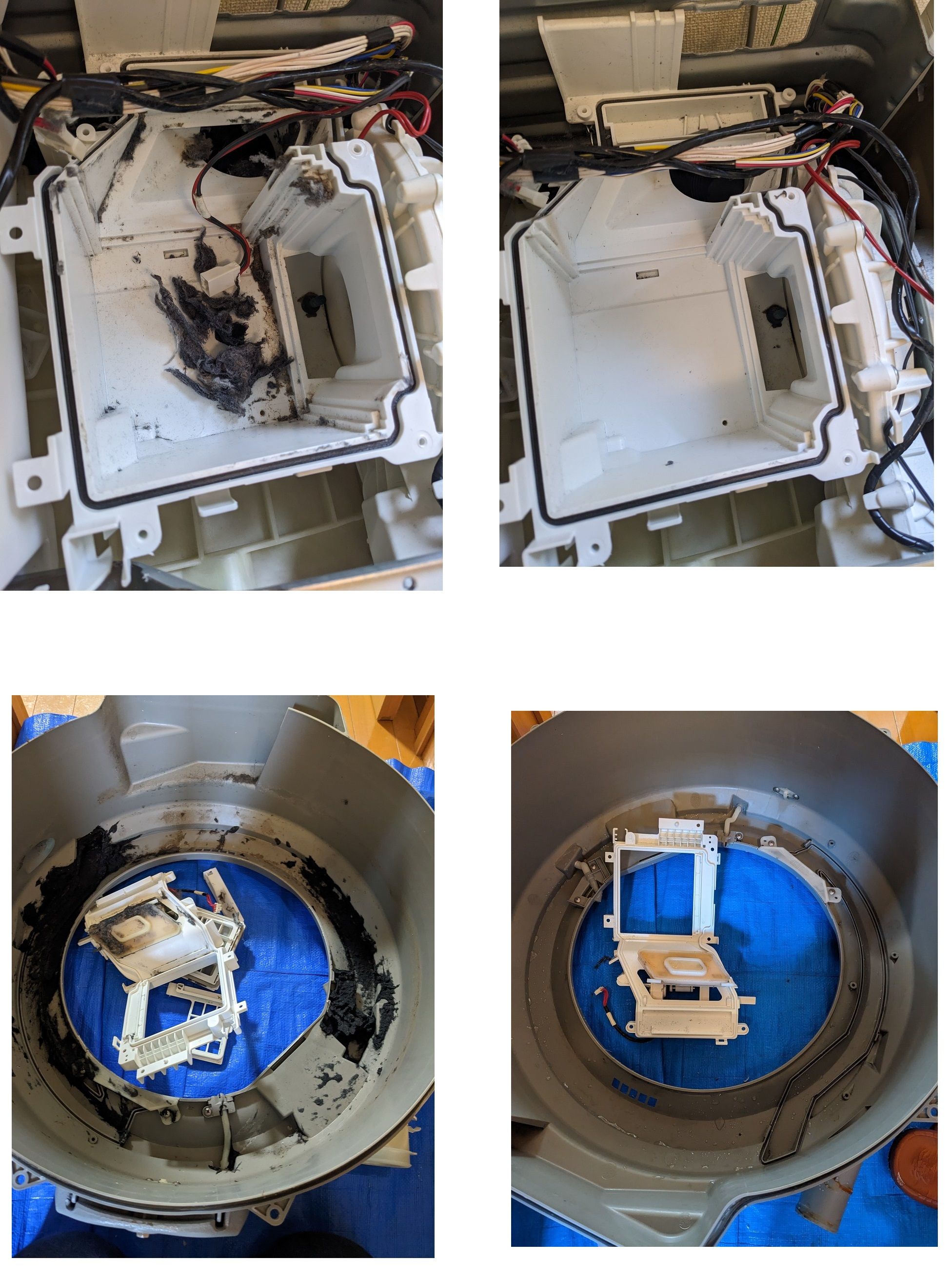 日立製は乾燥フィルターの奥にホコリが詰まって乾きが悪くなることが多いようです。分解してみると案の定、カバーの内側やフィルター奥にホコリが付着しておりました。