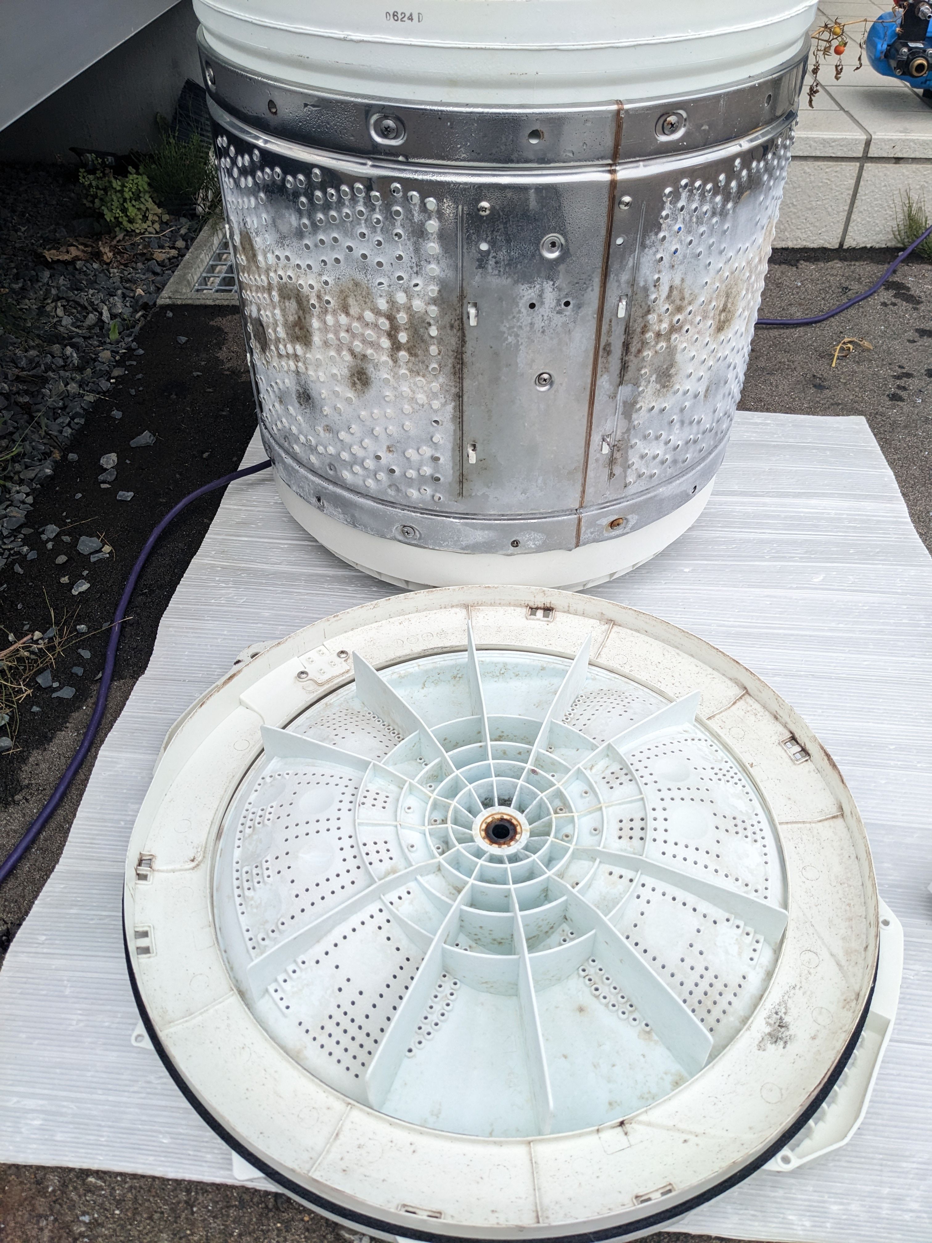 分解してみると、洗濯槽の外側には洗剤カスが付着しておりました。