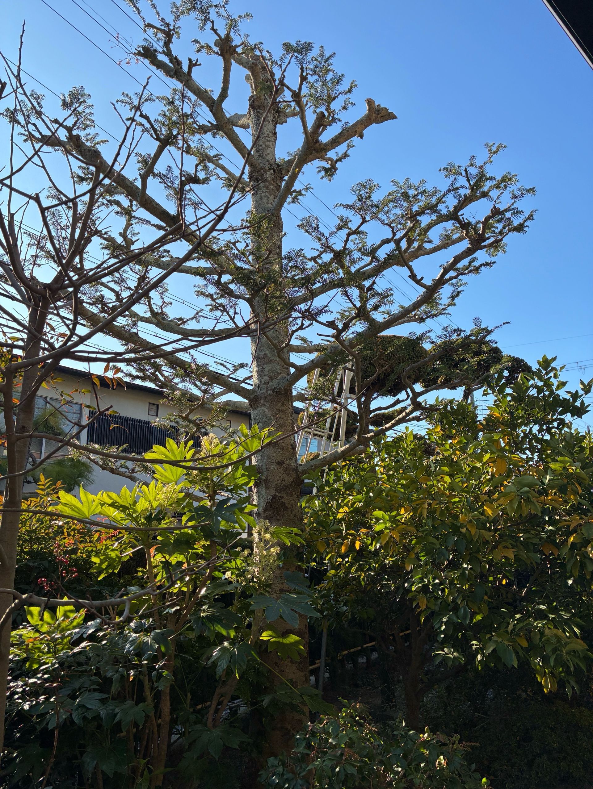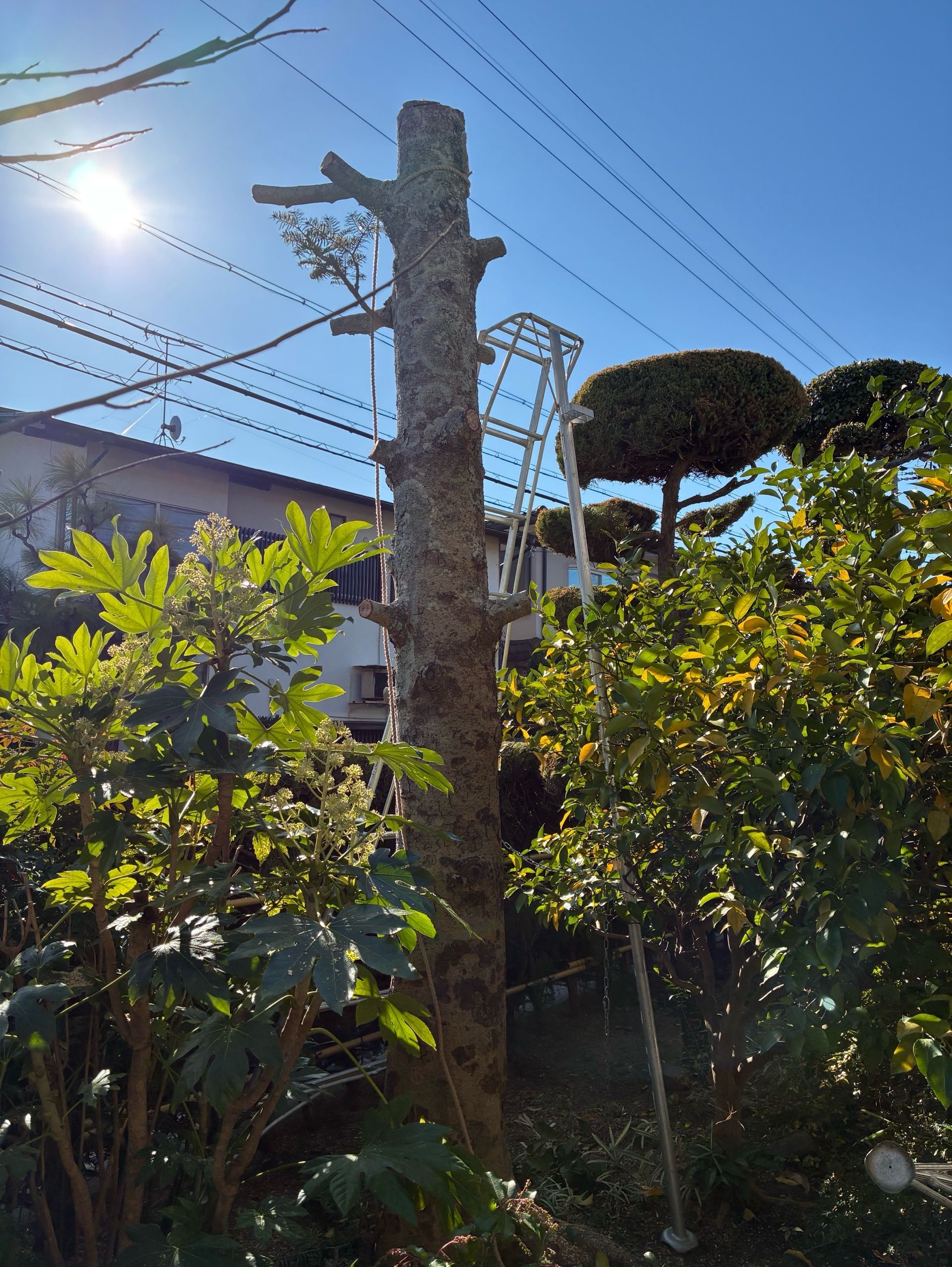 ロープで木を吊って 少しずつ木を切って下まで 切ってきました。