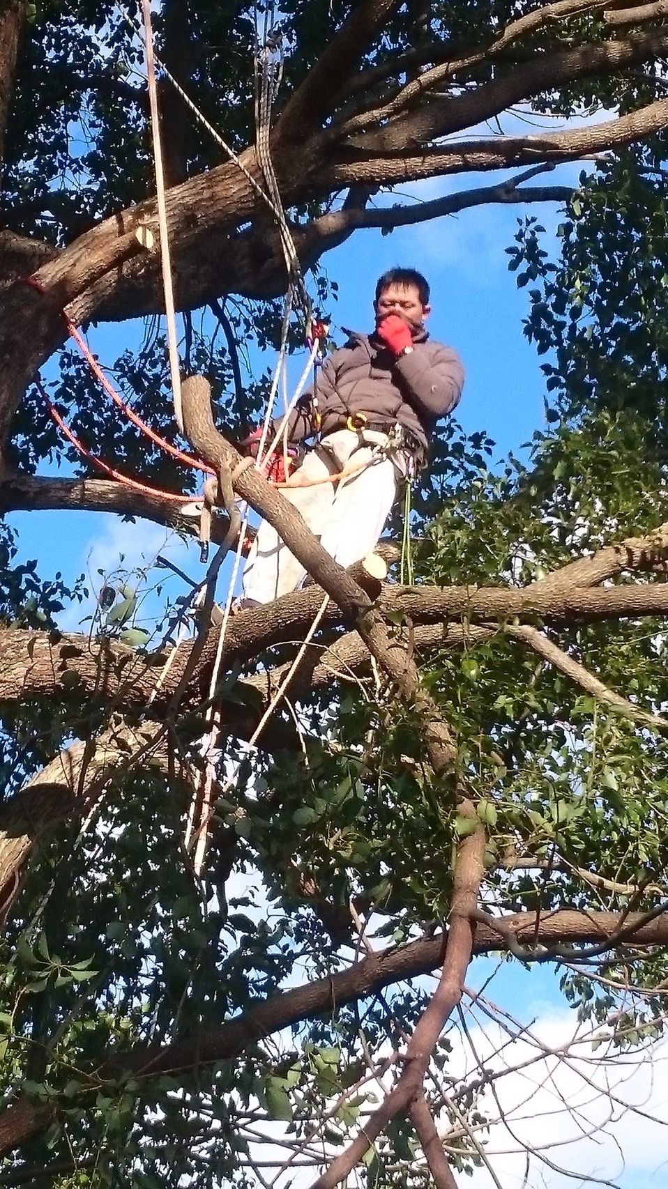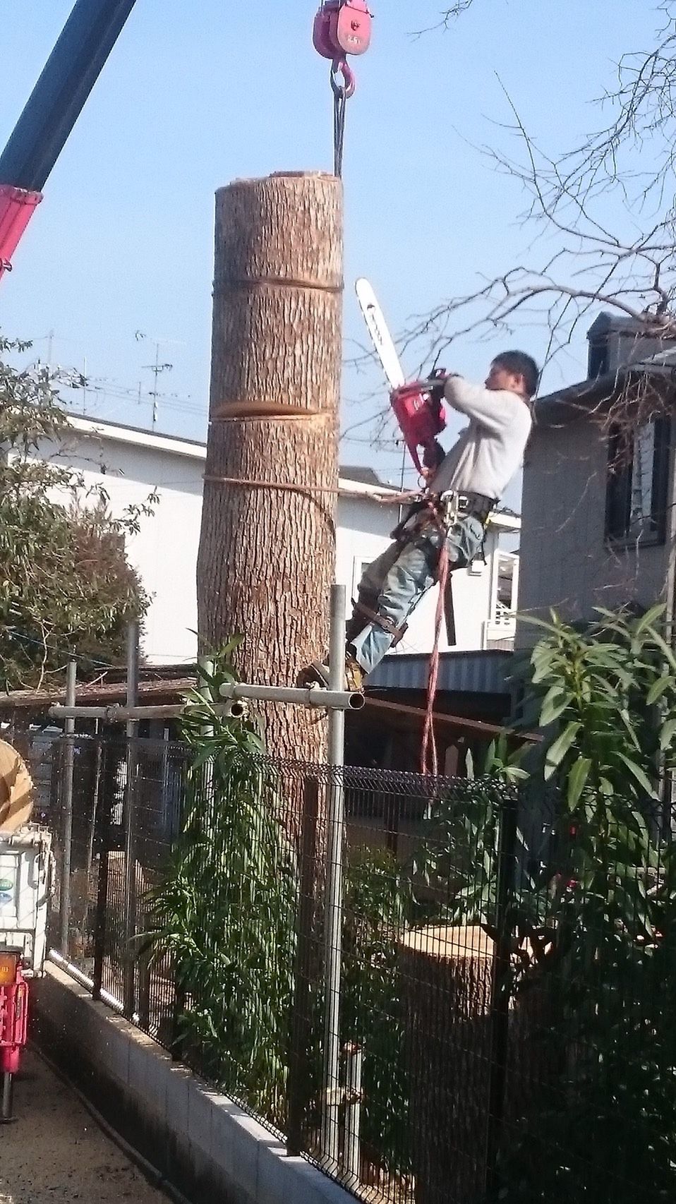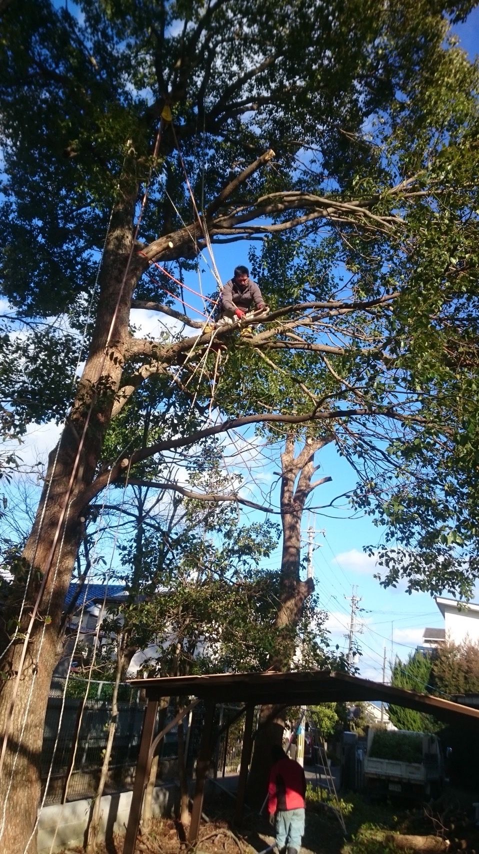 ハーネスをつけての作業で、専用のロープで枝払いをして、何事もなく作業完了。