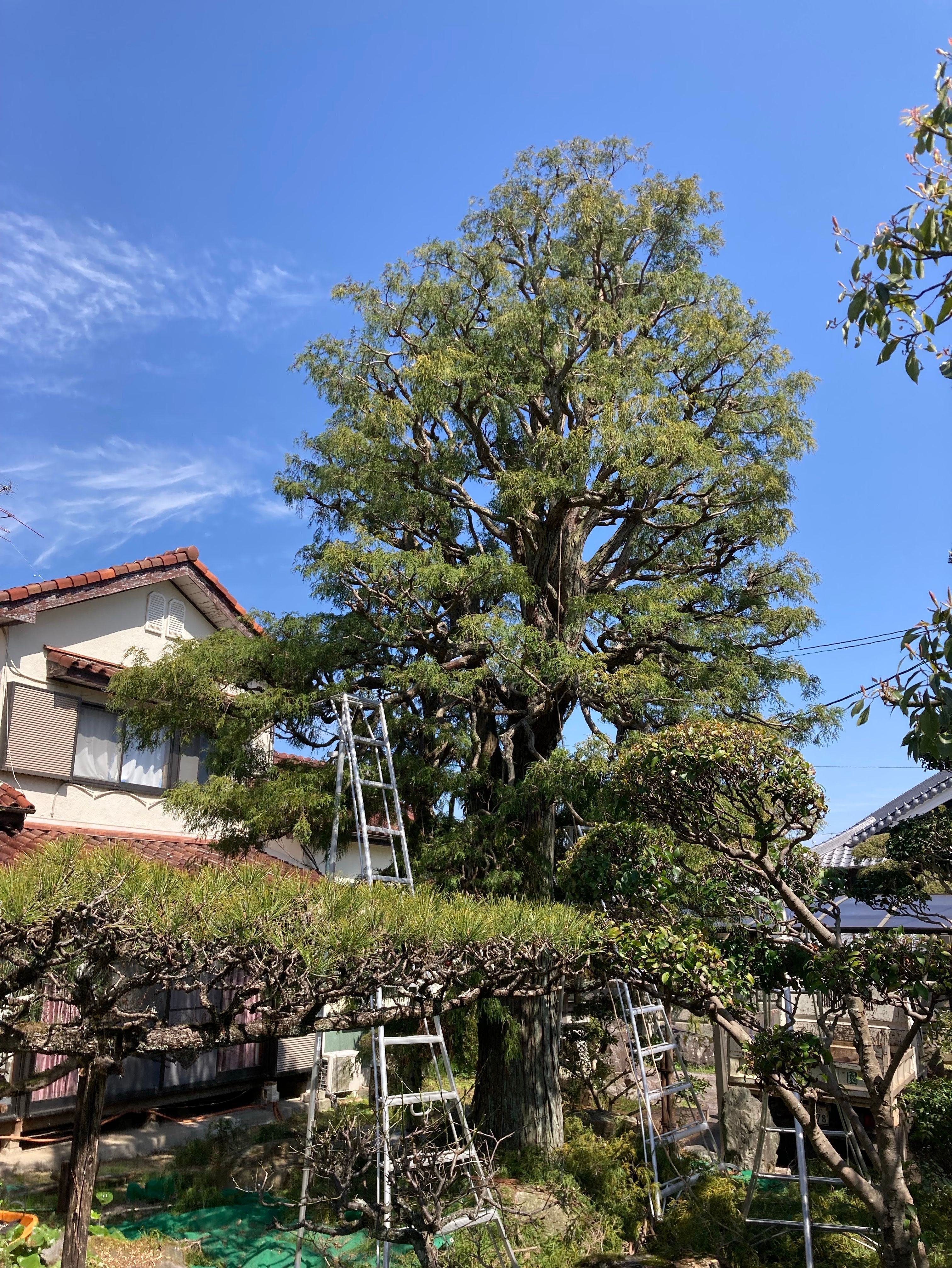 巨大イトヒバの剪定、年に一回の剪定、2日間お疲れでした。 なかなかこんなに大きなイトヒバは珍しいですね。