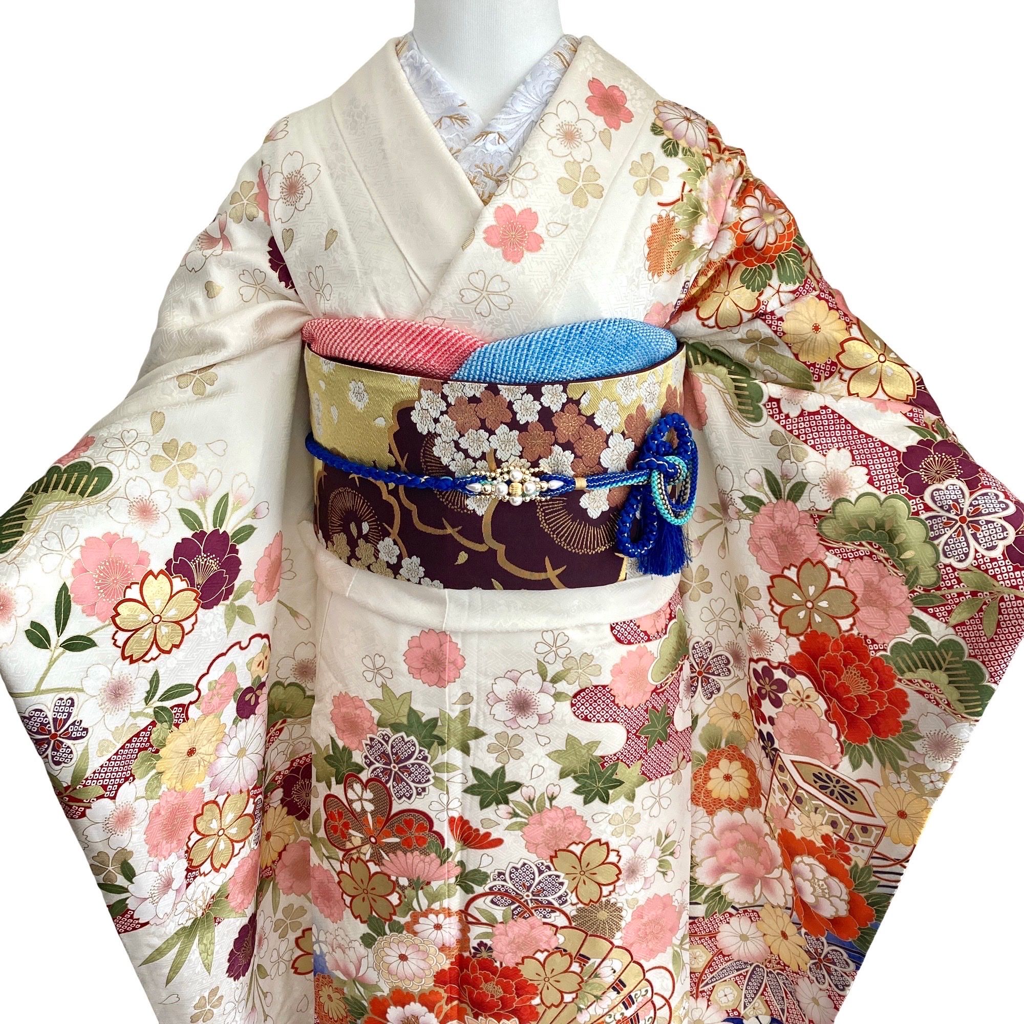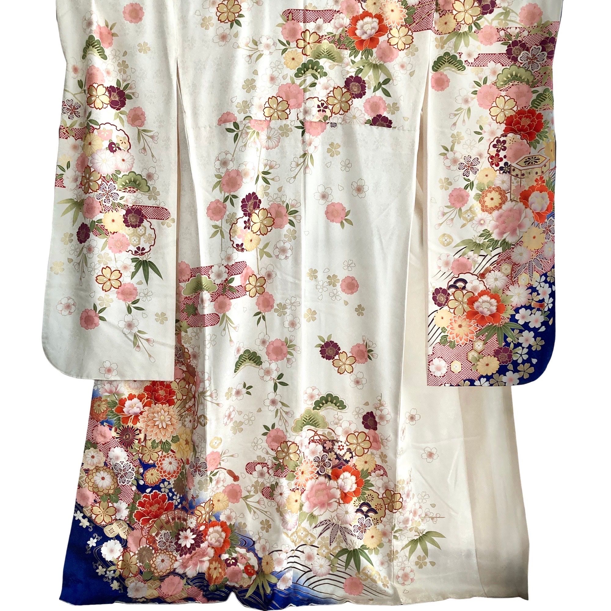 レンタル 現代振袖やわらかなアイボリー地に、桜や菊、牡丹などの吉祥花が華やかに咲き広がる振袖です。淡い色合いを基調としながら、裾元には深みのある藍色が配され、全体の印象をすっきりと引き締めています。成人式や晴れの日の装いにふさわしい一着です。