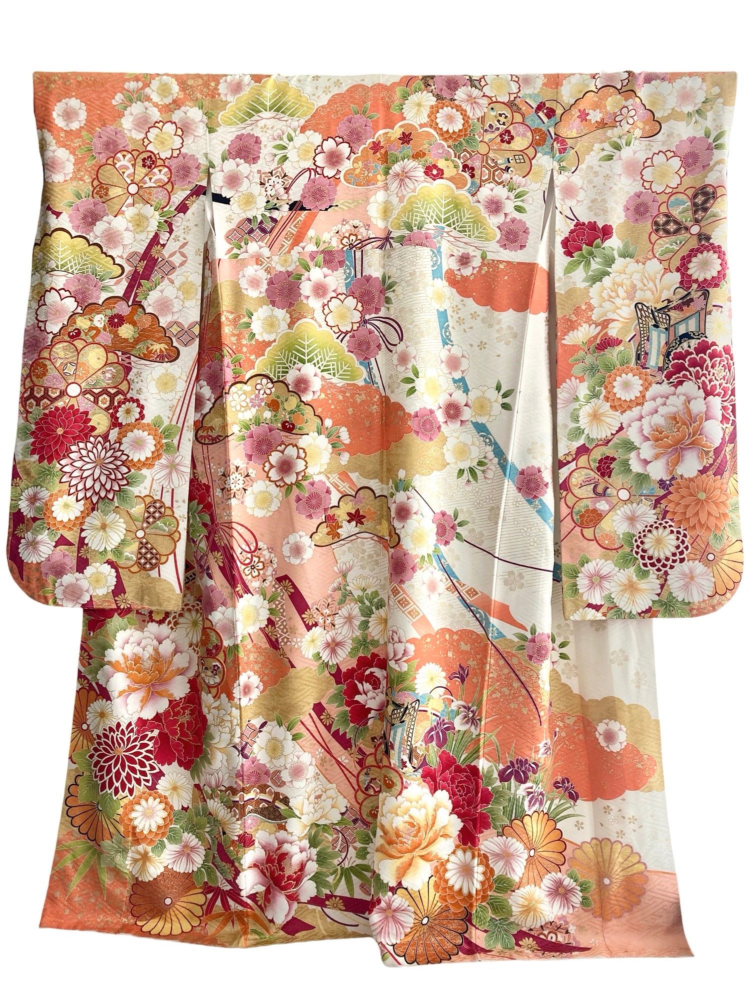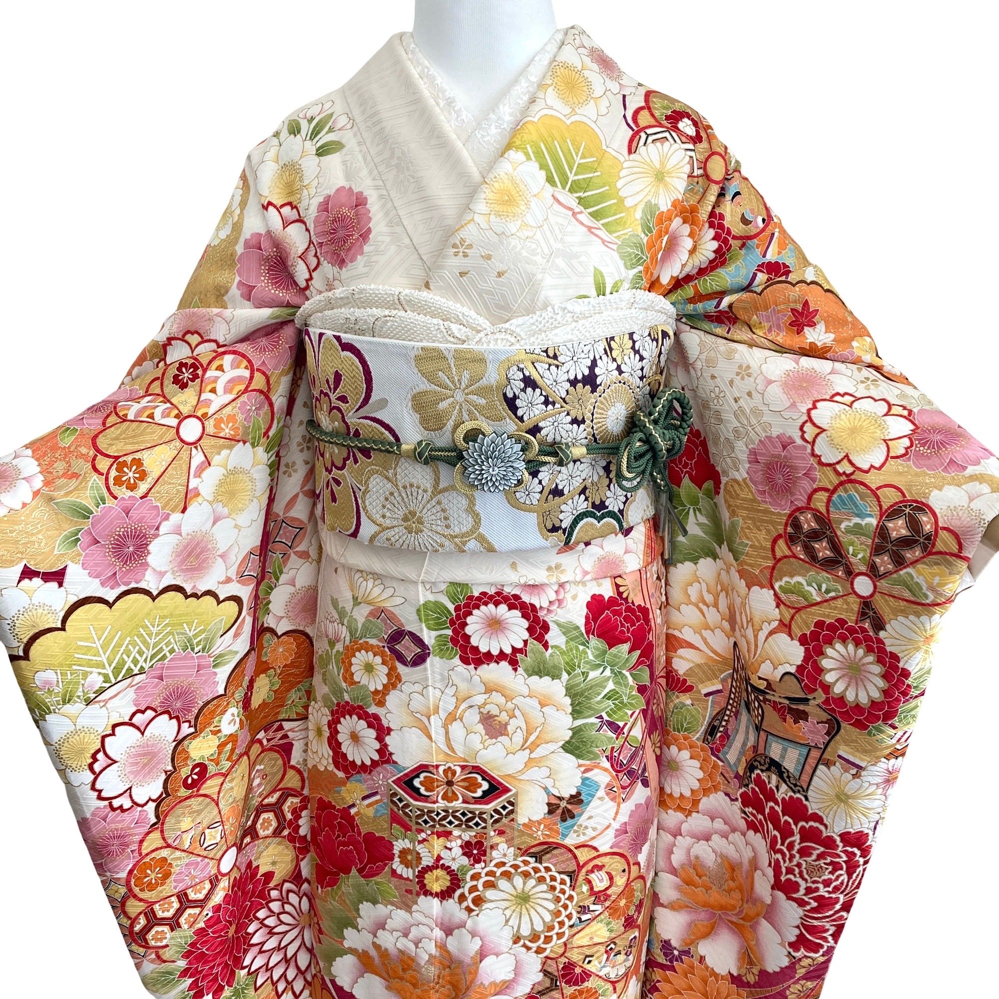 レンタル 現代振袖白とオレンジを基調に、牡丹や菊、宝尽くし、御所車などおめでたい文様を華やかにあしらった振袖です。金彩がほどよくきらめき、光の加減で優雅に印象を変える美しい織り模様。華やかさと上品さをあわせ持ち、成人式や前撮りなど、晴れの日を彩る一着です。レンタル振袖¥68,000