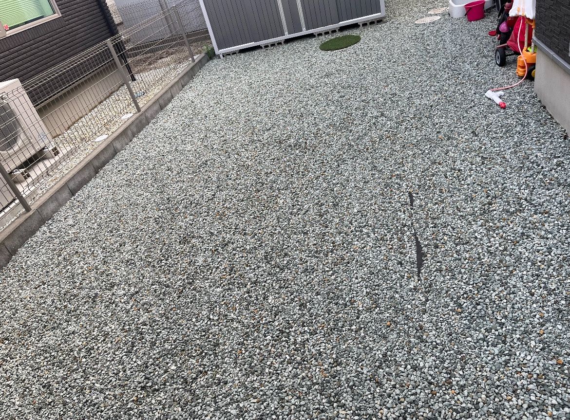 施工前は砂利敷きのお庭でした。雑草対策には効果的ですが、