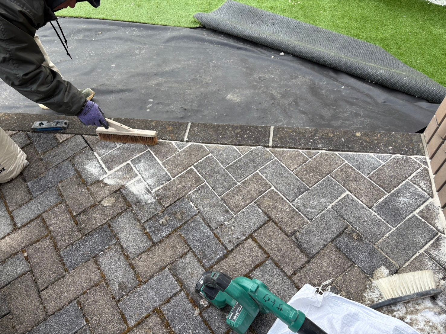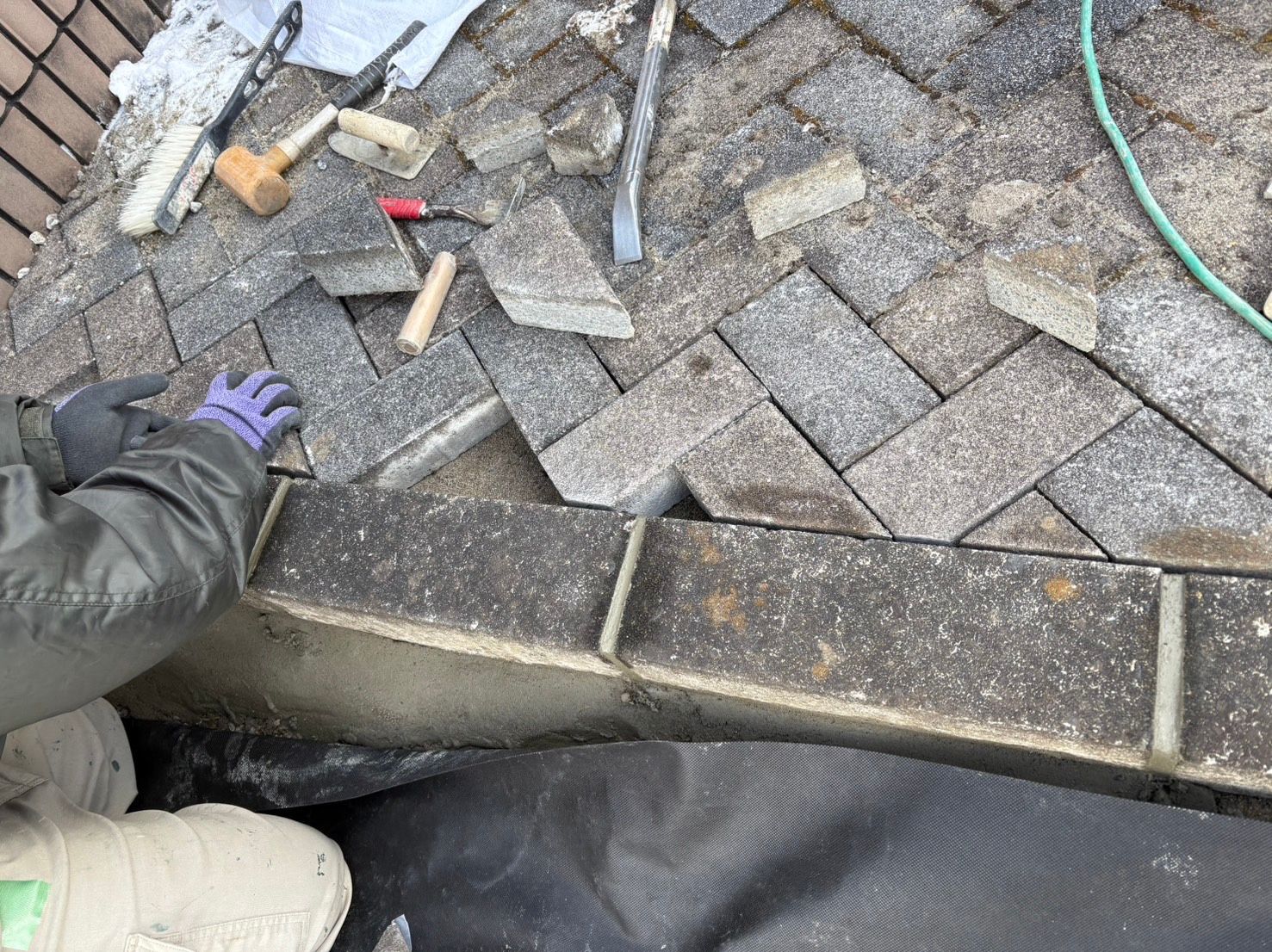 今回の現場では、既存の平板・舗装部分を確認しながら、人工芝との取り合い部分を丁寧に調整しました。