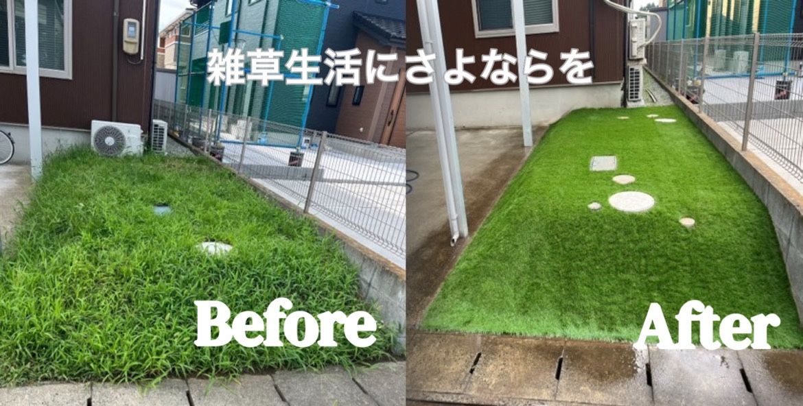 雑草に悩まされていたお庭が、人工芝によって 手入れ不要で快適なスペース に生まれ変わりました。
