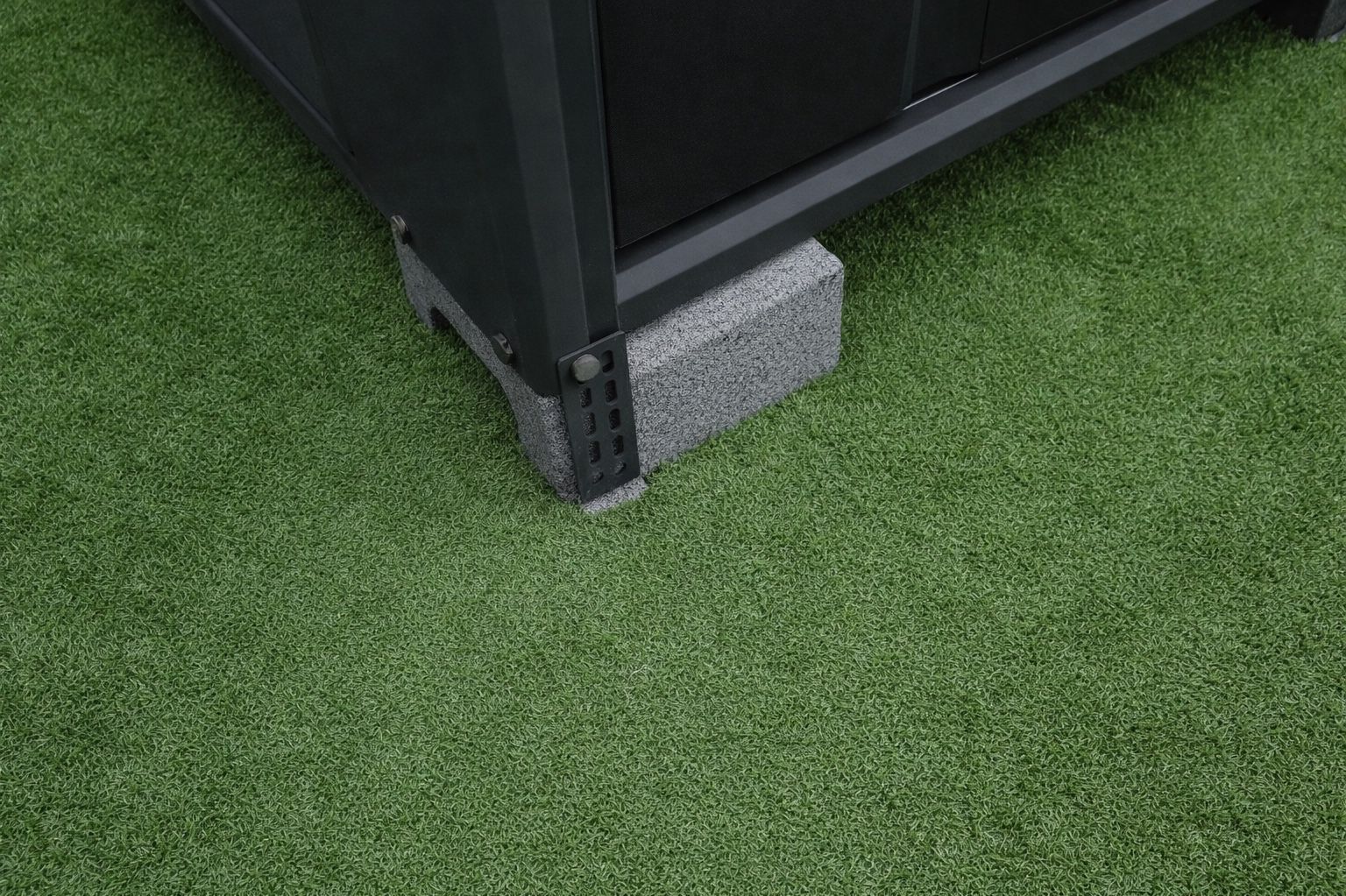 写真のように、基礎ブロック+金具で物置の脚をしっかり固定します📌