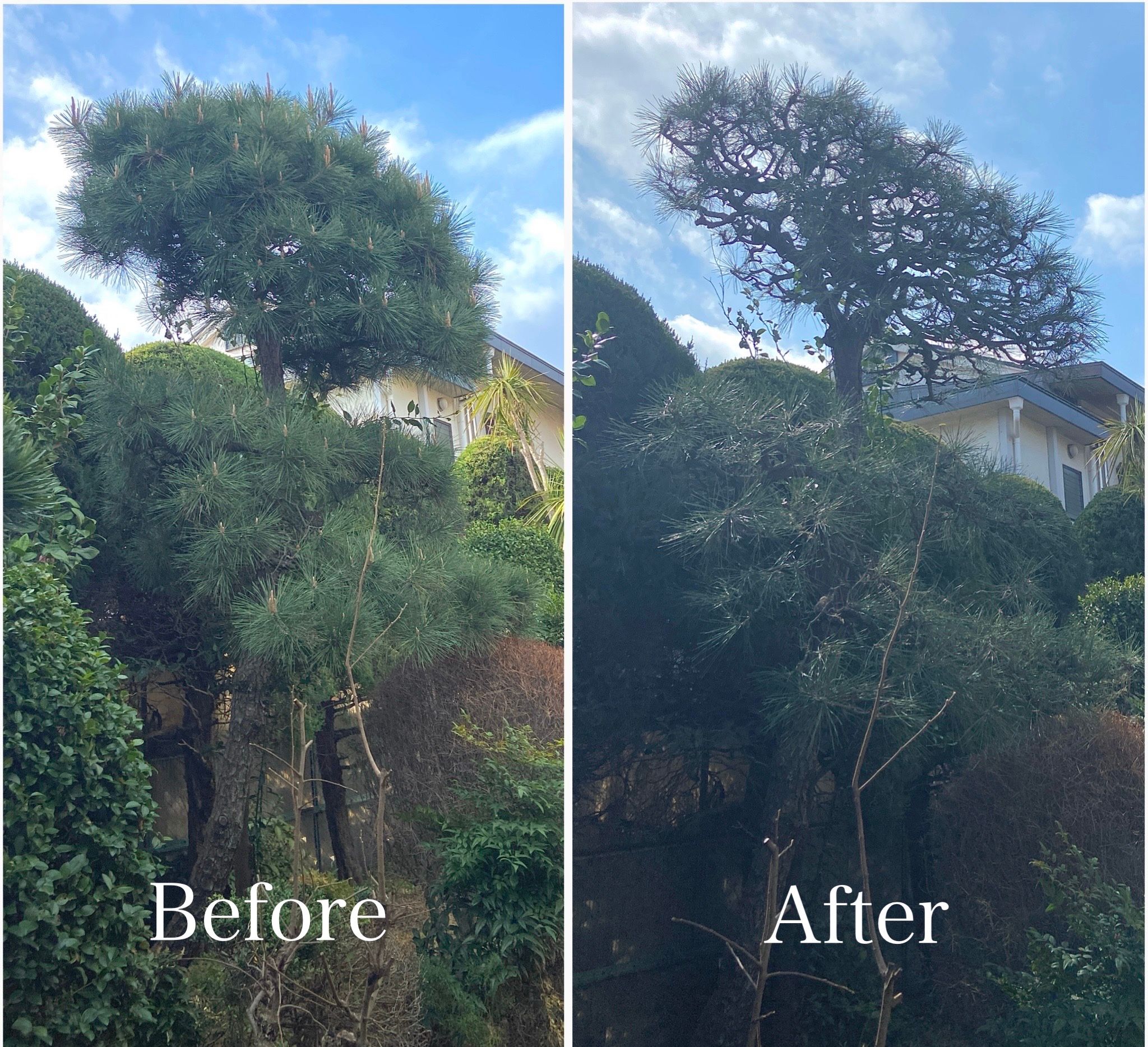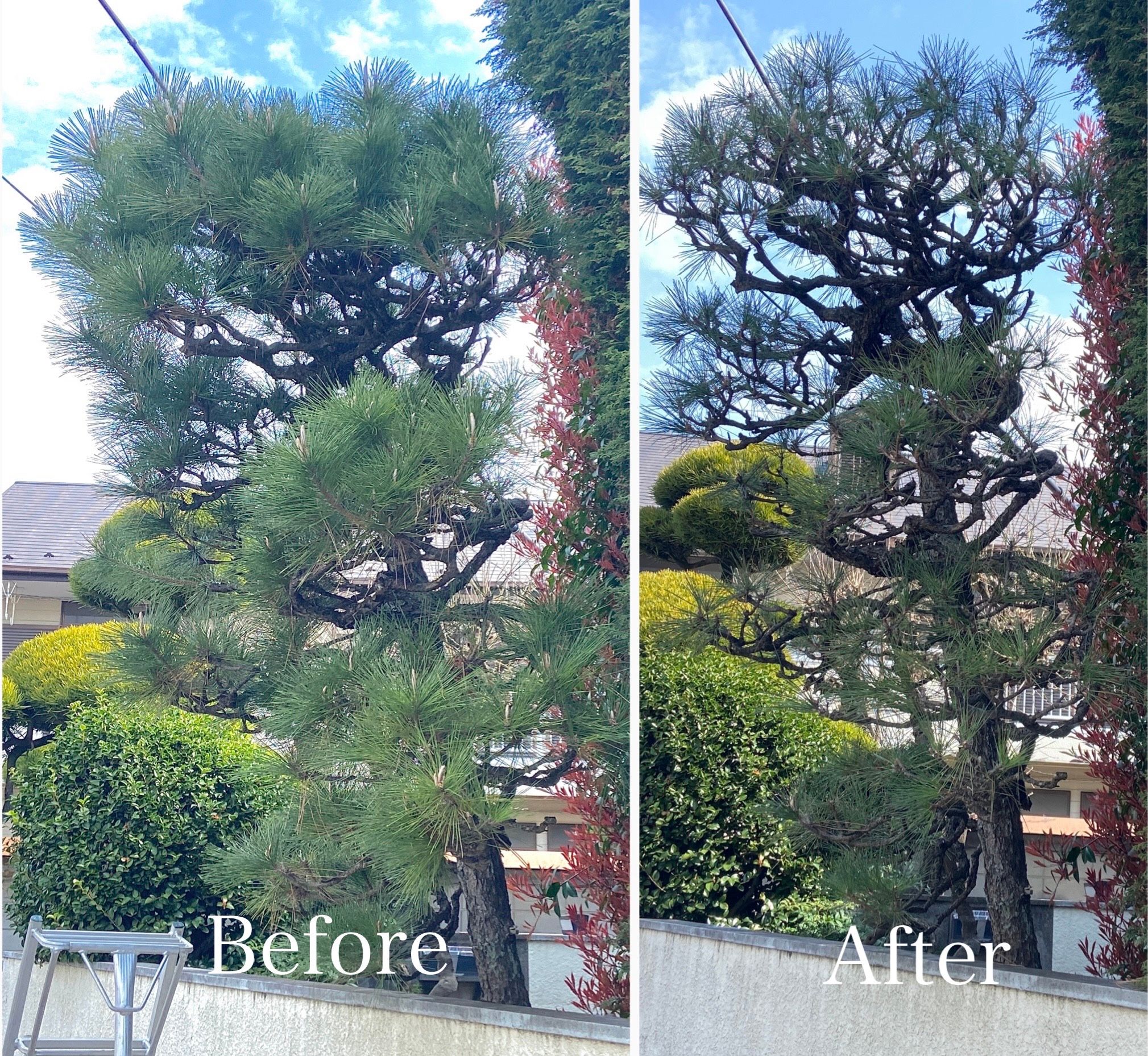 写真の通り、剪定後は枝ぶりがはっきりと見えるようになり、松本来の美しさが引き立つ仕上がりとなりました。
