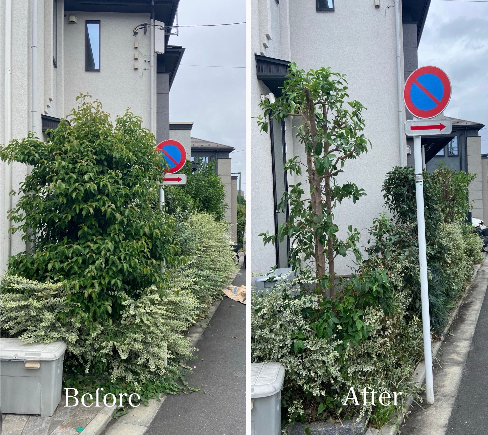 「木が伸びすぎて標識が見えない」「通行の邪魔になってしまっている」とのお悩みを解消するため、丁寧に剪定・整枝を行いました。